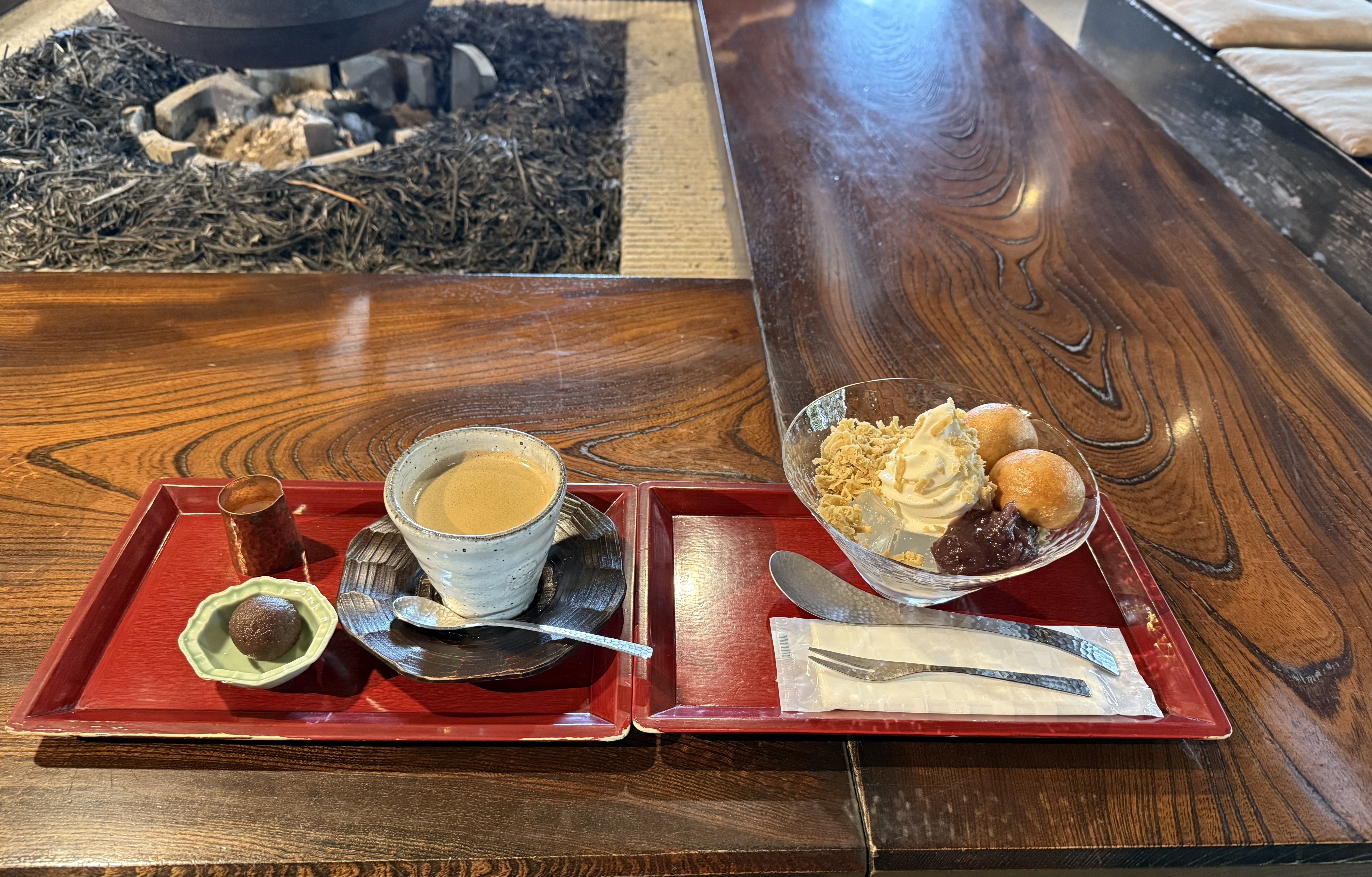 囲炉裏を囲む古民家の雰囲気の中で遅めのお昼?早めのおやつ?をいただきました❣️