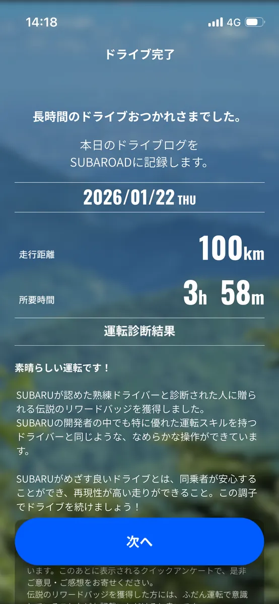 ここから奥多摩周遊道路をどんどん進んでいきます。一部路肩に雪が残ってますが、路面は完全アスファルトです。ところどころ路肩に氷や枝葉があり注視しながら運転が必要です。道路終点までスバル運転診断の区間とのことでしたが、何も考えずワインディングを楽しみます笑。結果は以下、なんかあざます😊