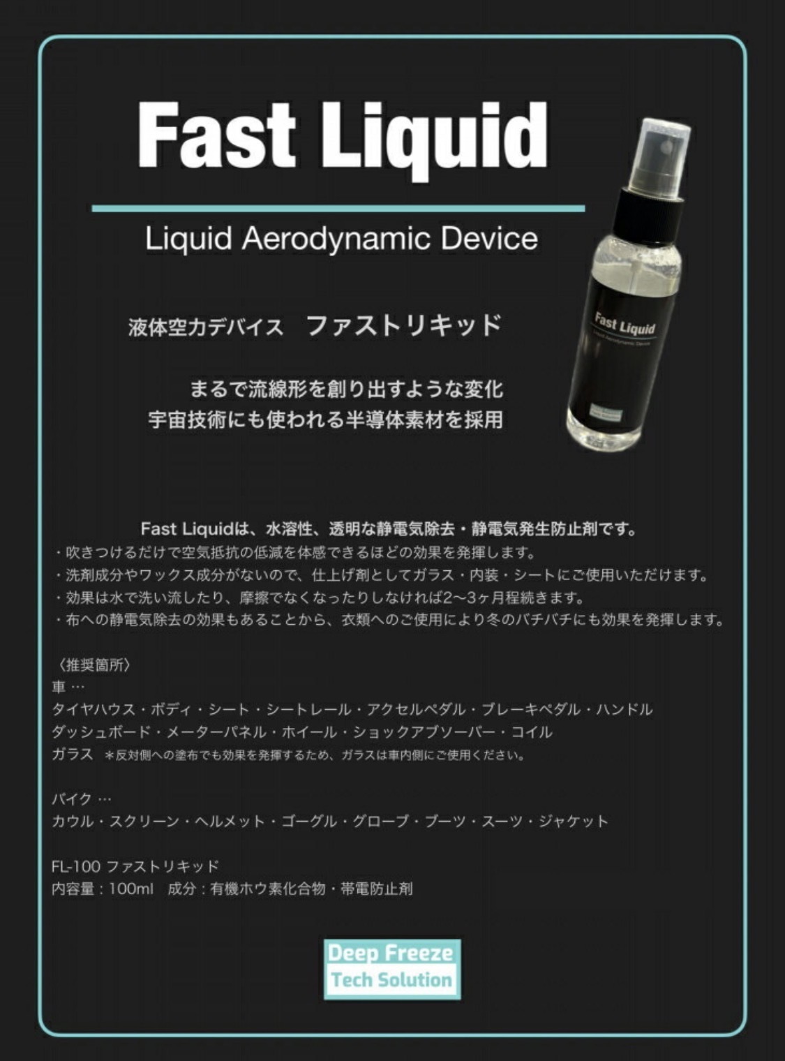 これ、静電気除去&空気抵抗低減を目指した液体デバイスだそうです(液体版アルミテープ、と勝手に捉えてます)。静電気除去大好きっこの僕は、お酒の力もあり笑さっそく1本購入しました。