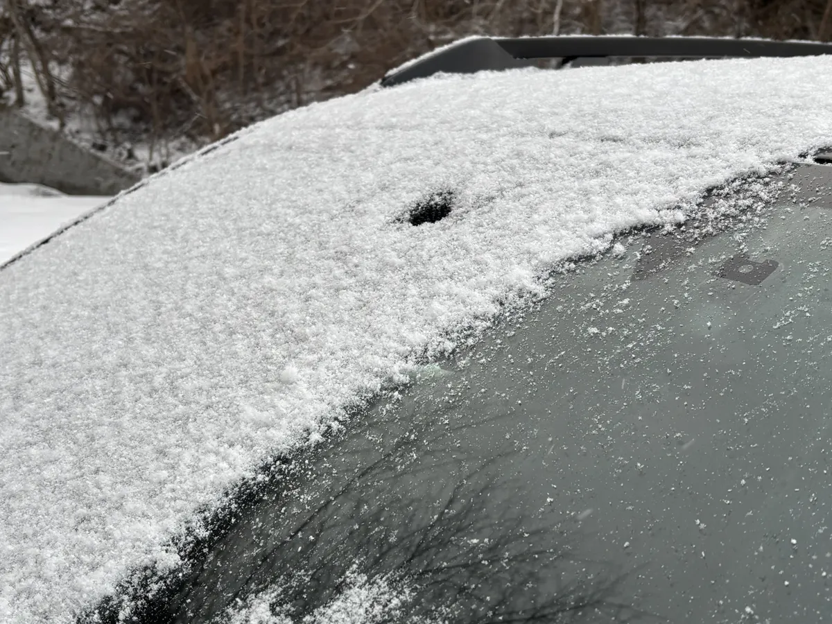 熱線で雪が溶けたリアウインドウ。