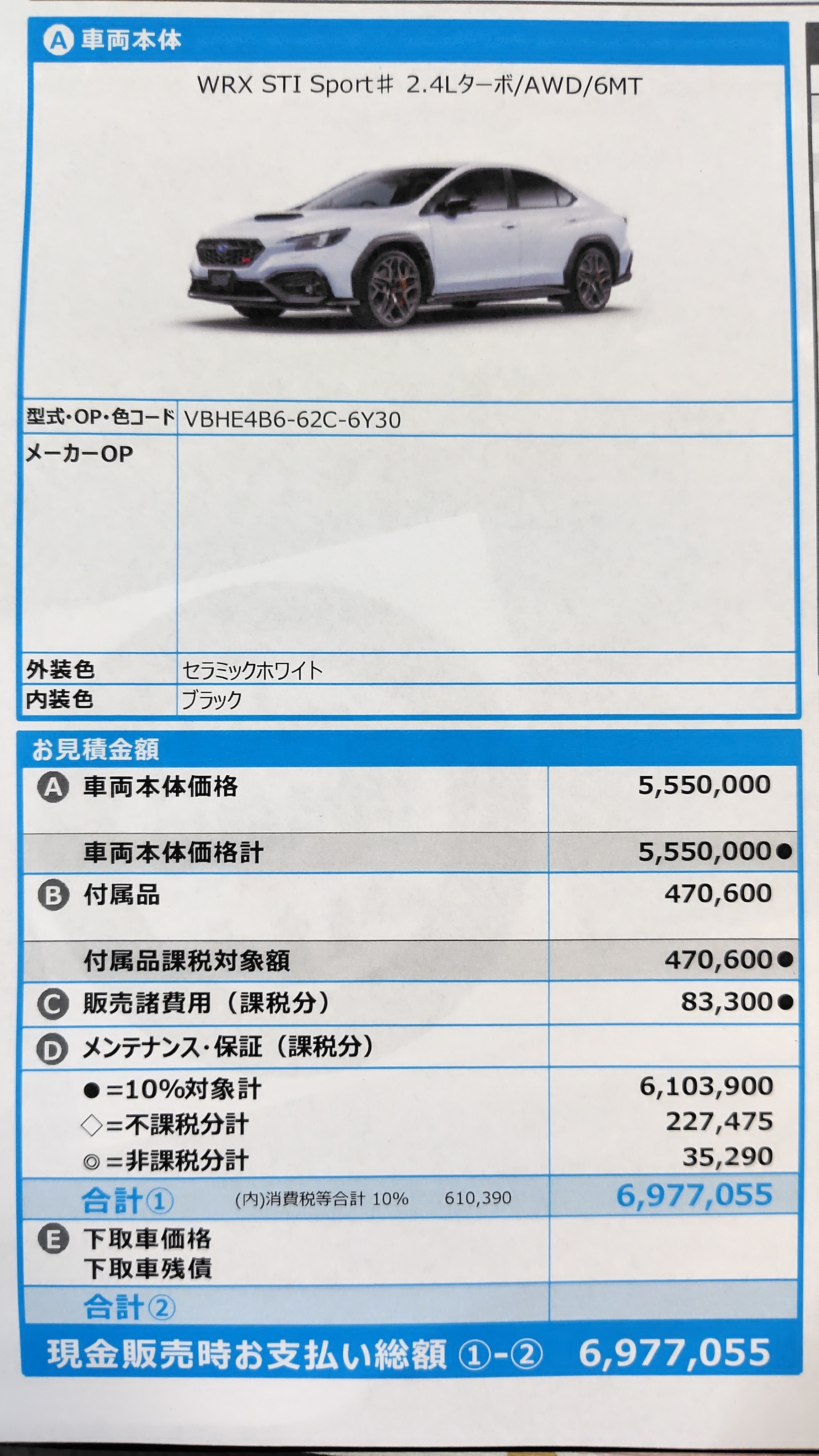 見積書を作成(抽選申込みには必須)してもらいましたが、エアロキットやETC、ドラレコなどのオプションを入れて約700i万円…