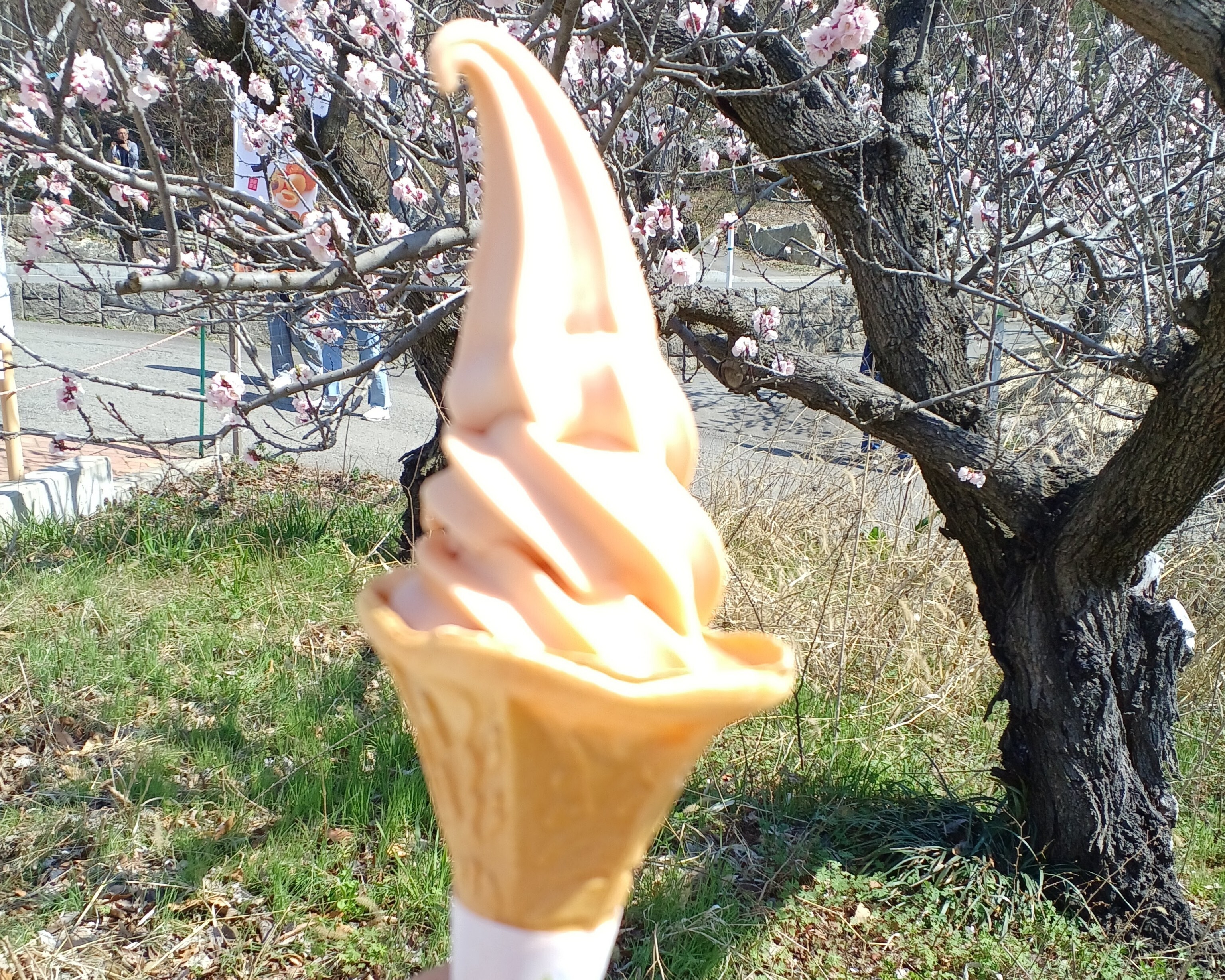 あんずソフトです。 たべものの写真を撮ったのも人生初🔰です😄 ピンボケしていていまいちですね。 私のたべもの係のデビューは、当分先になりそうです😅 あんずの味が濃厚でお花見気分も、盛り上がります☺️
