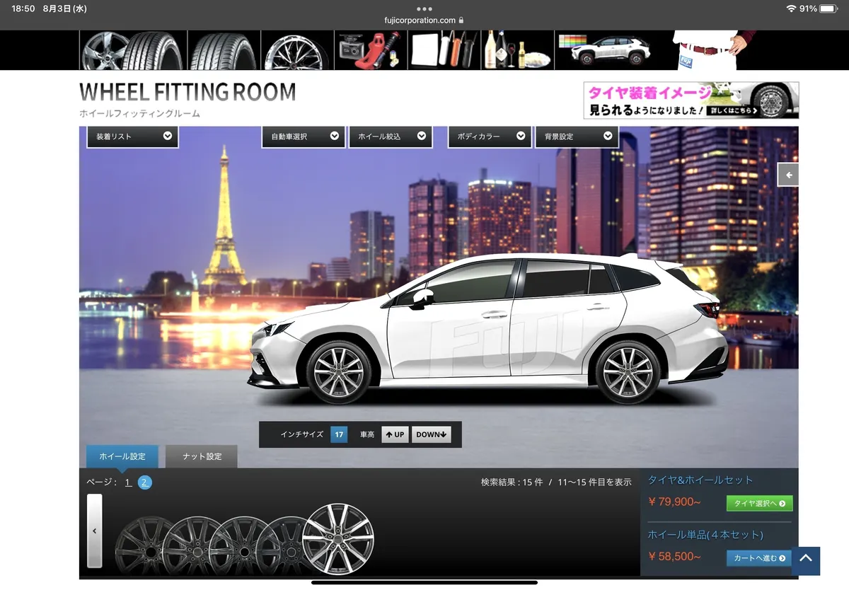 またフィッティングルームでシミュレーションできるので、自車に色々なホイールを組み合わせた姿が確認できます。