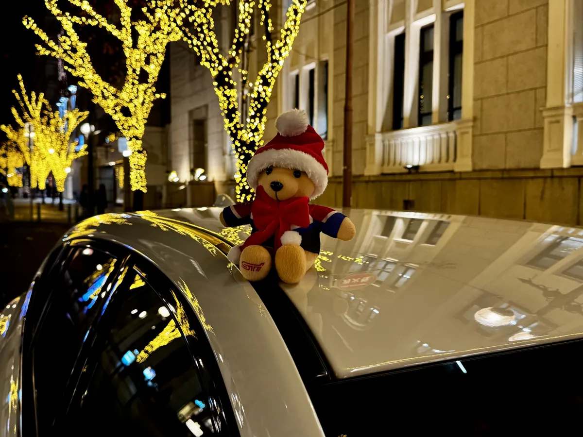 煌めくイルミネーションの中、真っ白なイケメンレヴォくんに乗った、小さな可愛いベアサンタ🎅