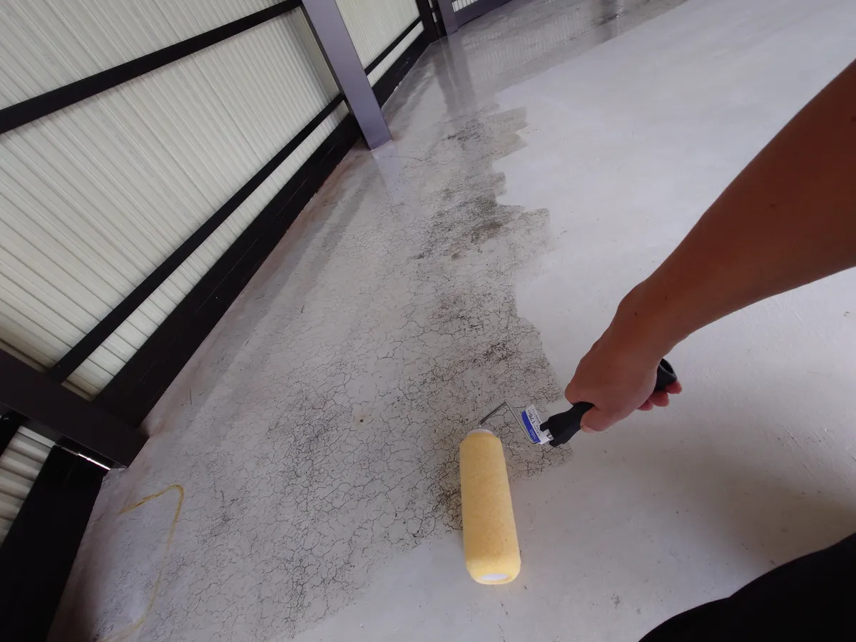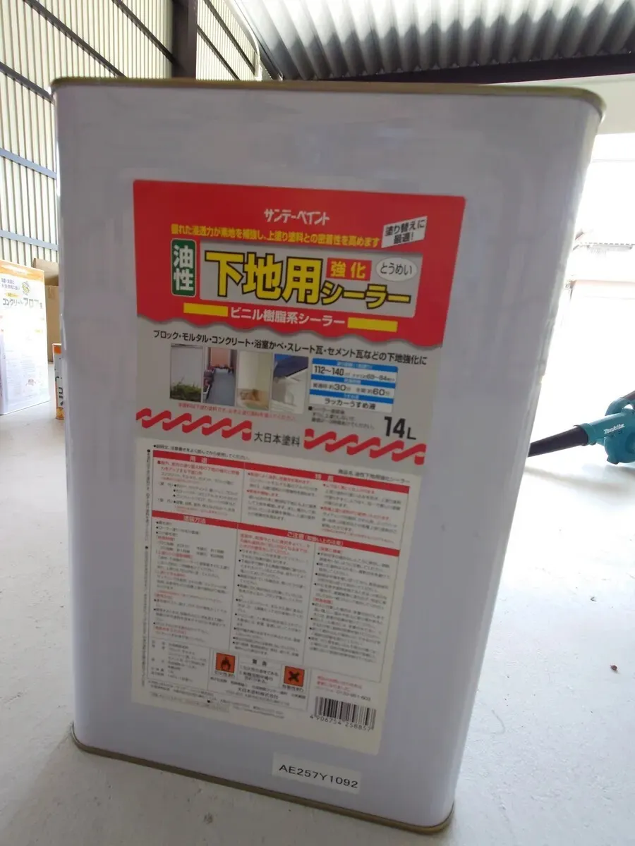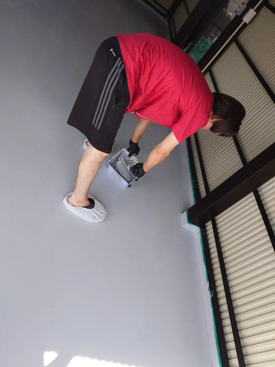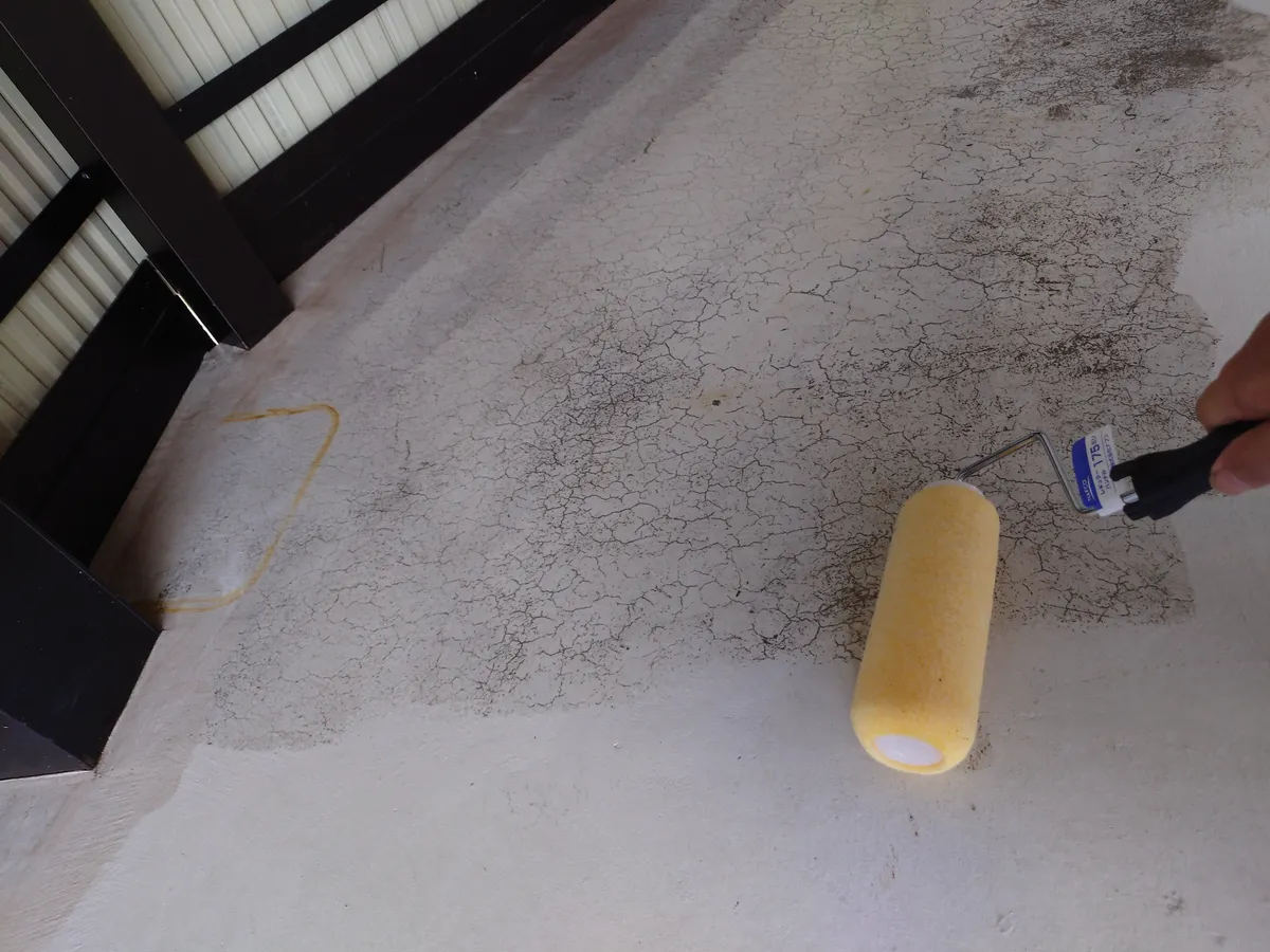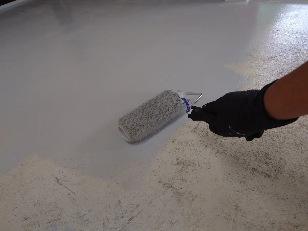 床面清掃の後、早速作業に取り掛かります。最初は塗装の付きを良くするために下地用シーラーを塗布します。