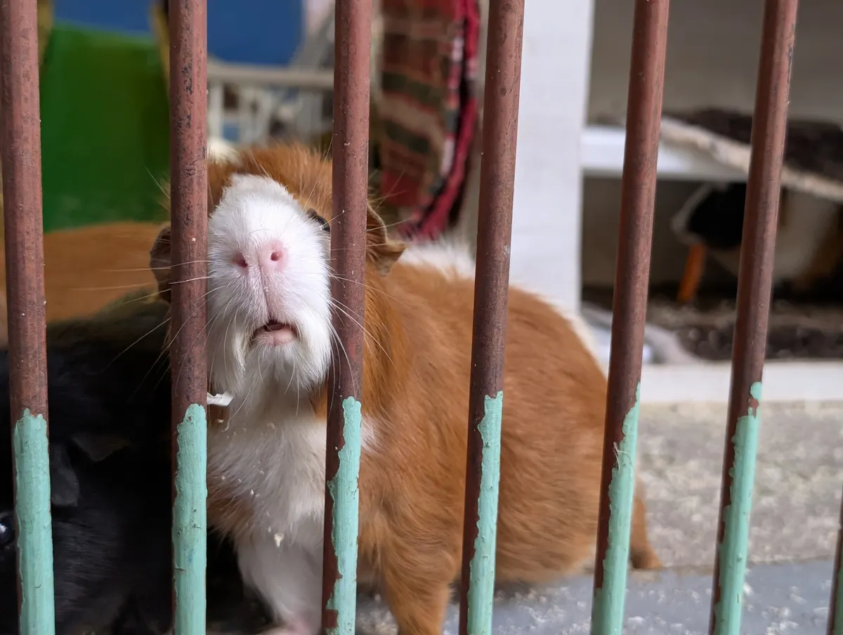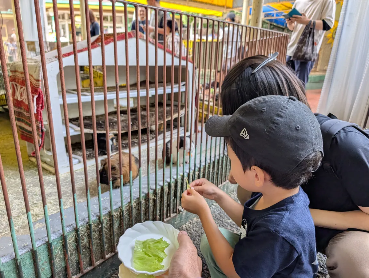 まずはモルモットとウサギがお出迎え。柵からはみ出したマズルがニンジンとレタスを奪い去って安全な所でムシャムシャしてました。