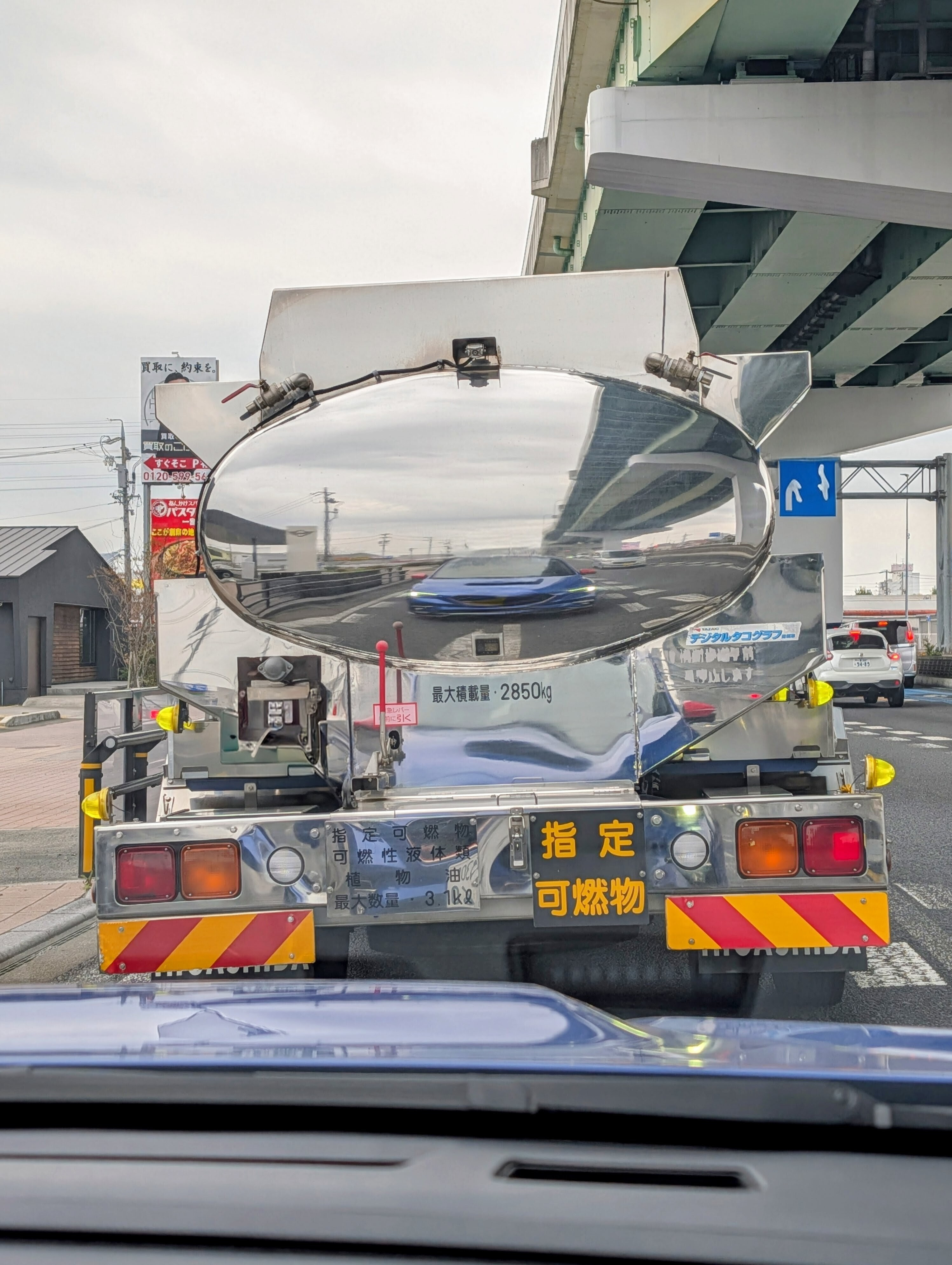 塗装されていないピッカピカに輝いたタンクローリーが前にいるとニヤリですよね。