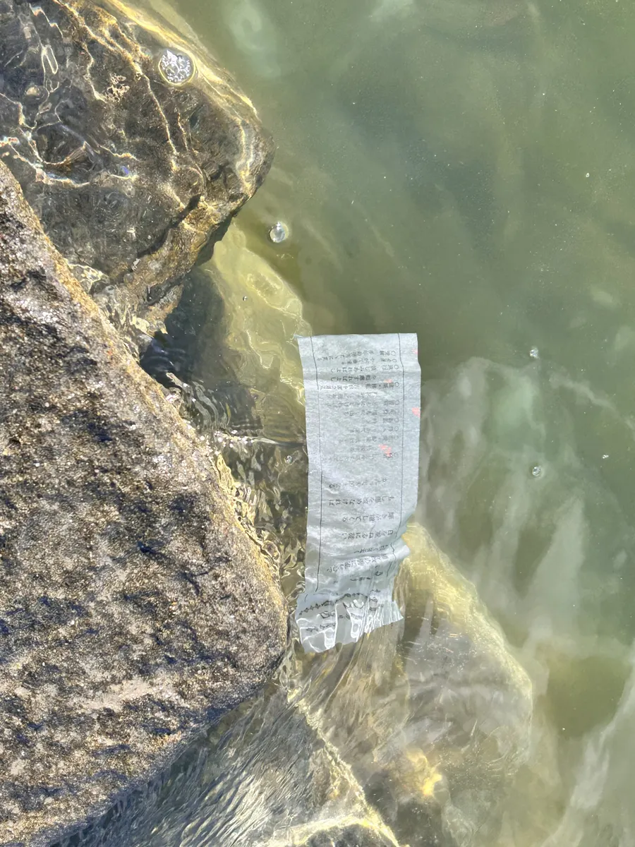 おみくじは前の海に流します。環境に配慮して水に溶ける紙で作られているので、浮かべるとすぐに溶けてなくなります。おみくじは吉。