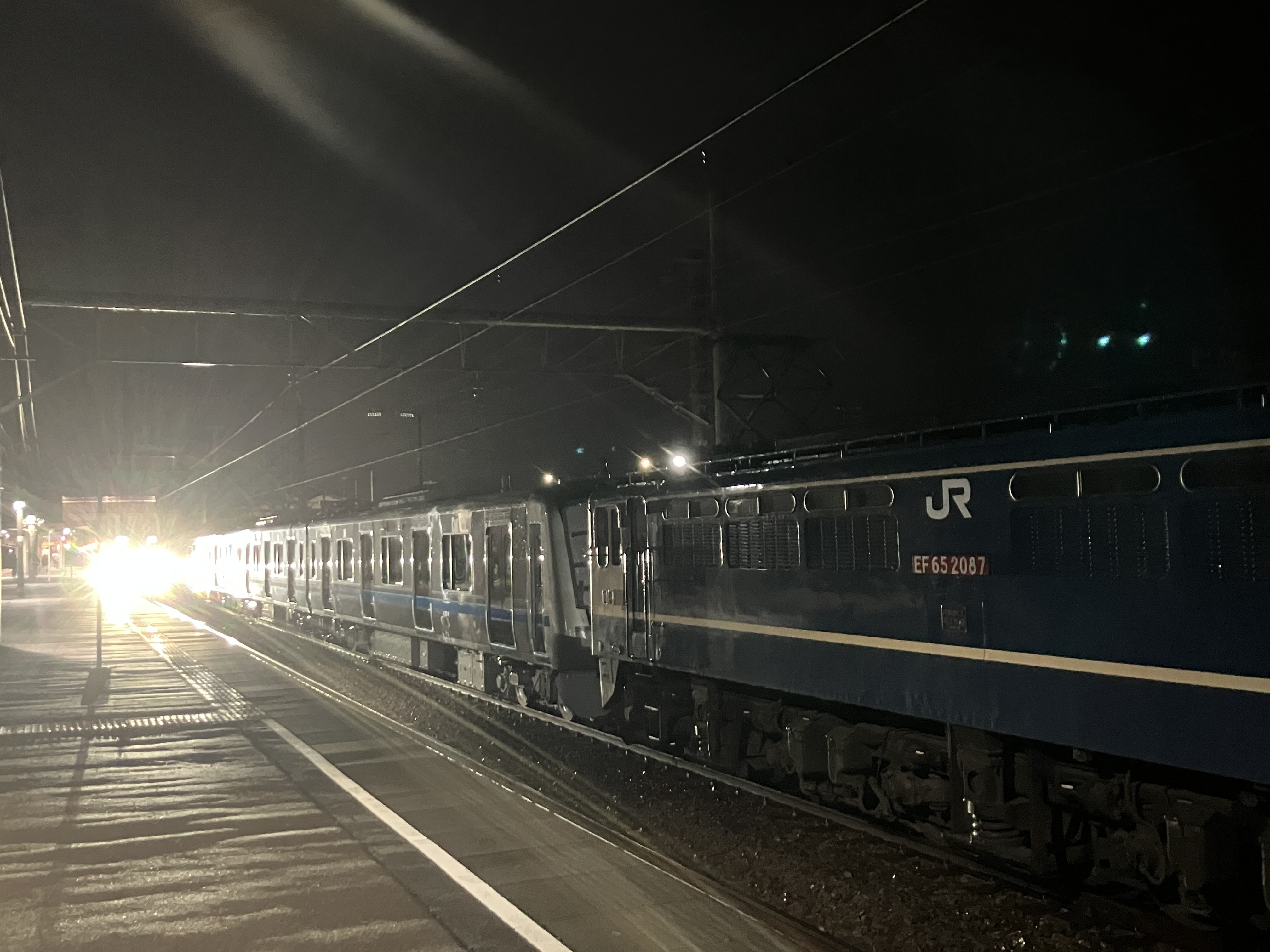 木曜の夜、JR東海道線某駅にて帰り電車を待っていると待避線に電気機関車が入って来ました。何やら見掛けない長い編成の列車を引いています。