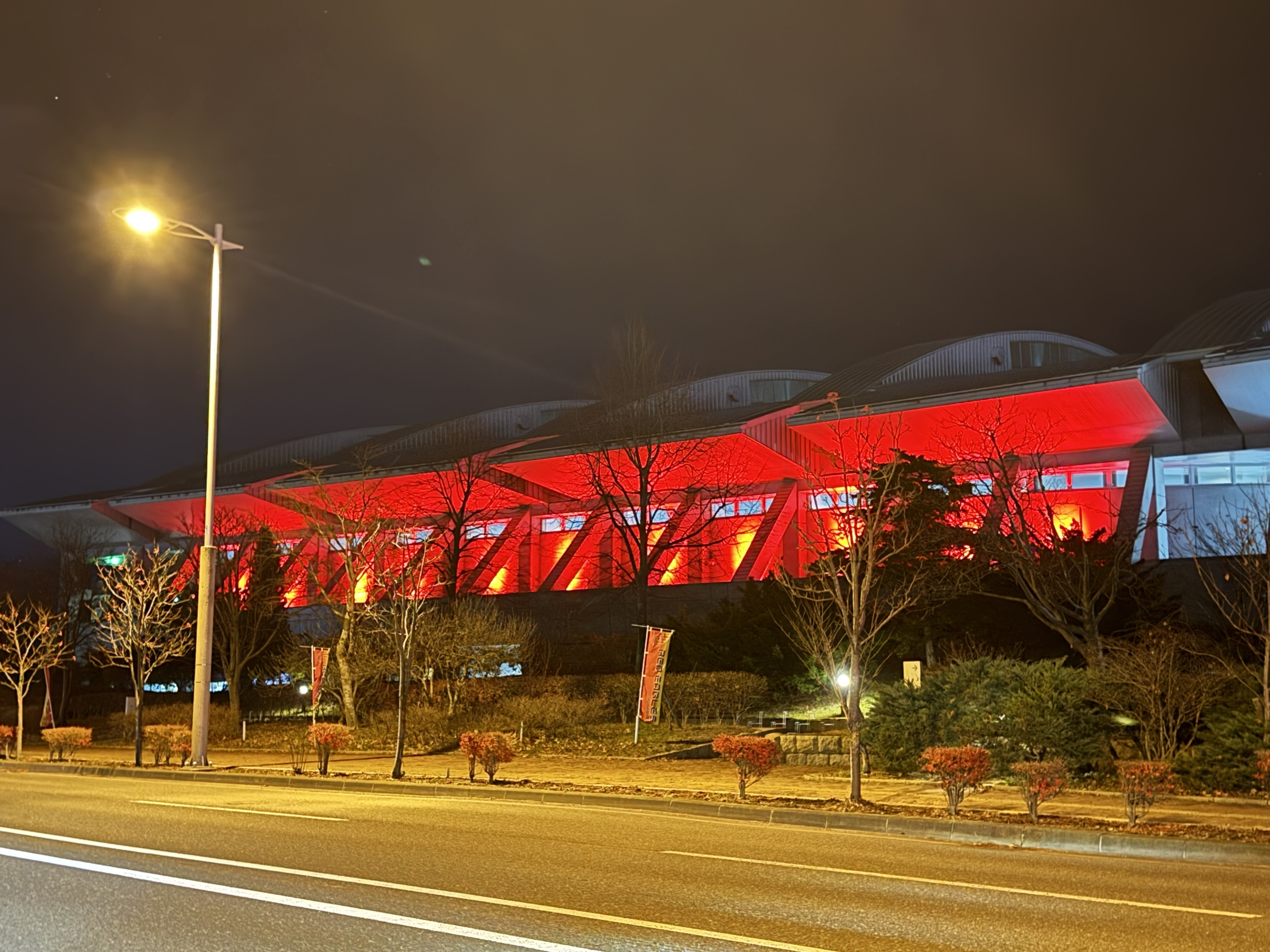 レッドイーグルスのチームカラーであるレッドにライトアップされてました。