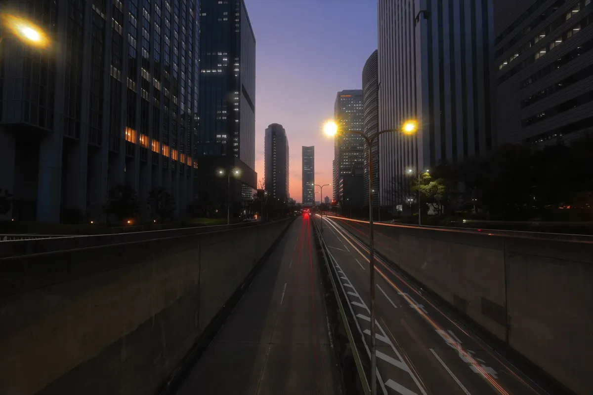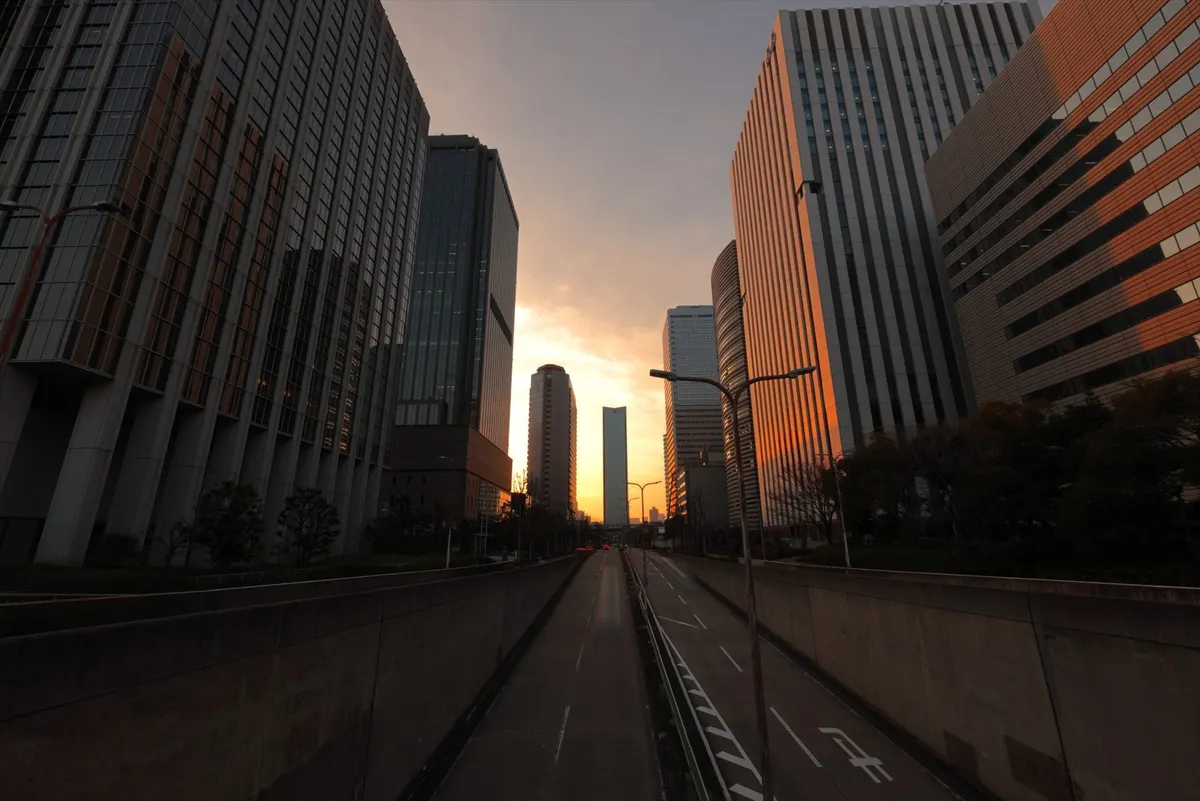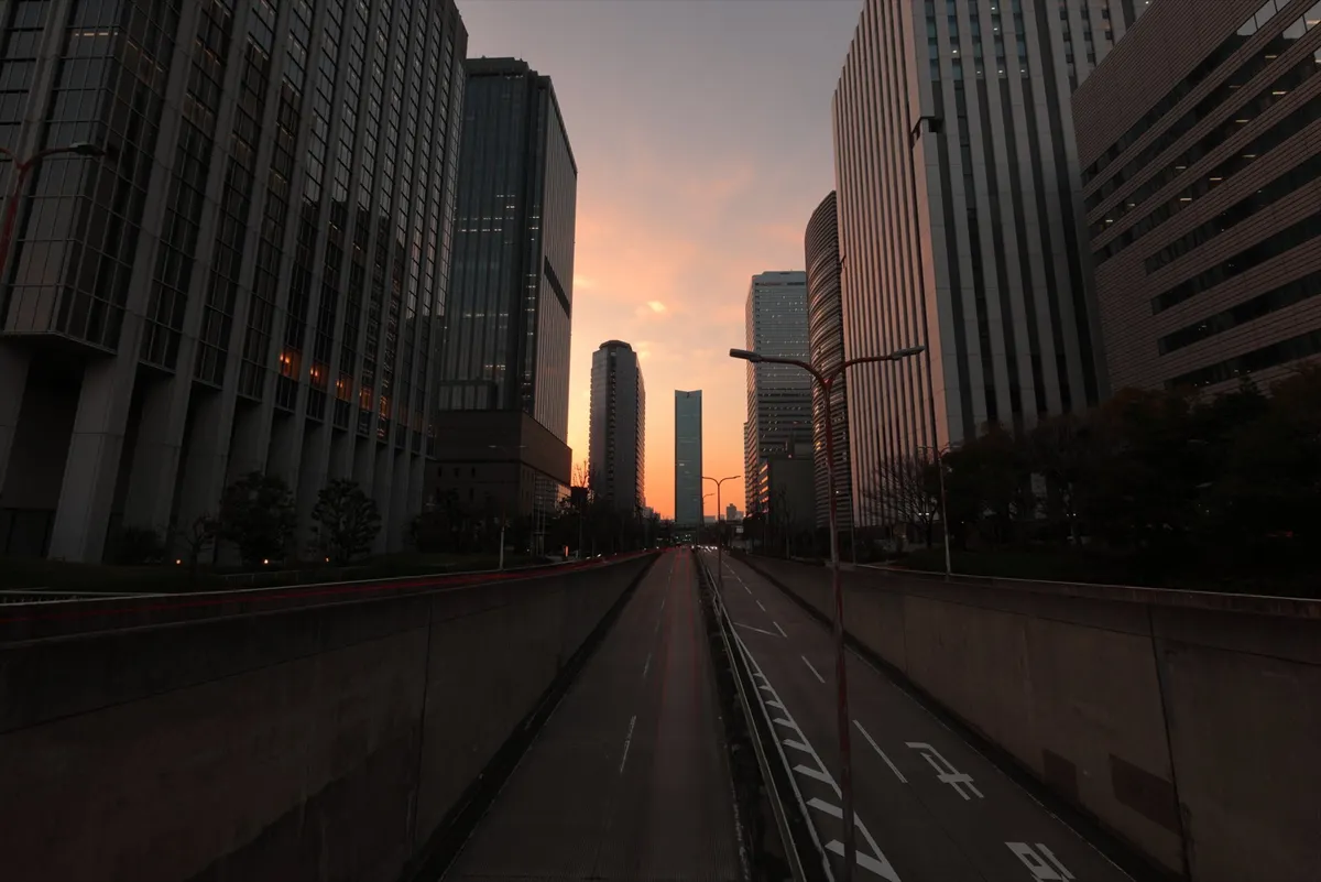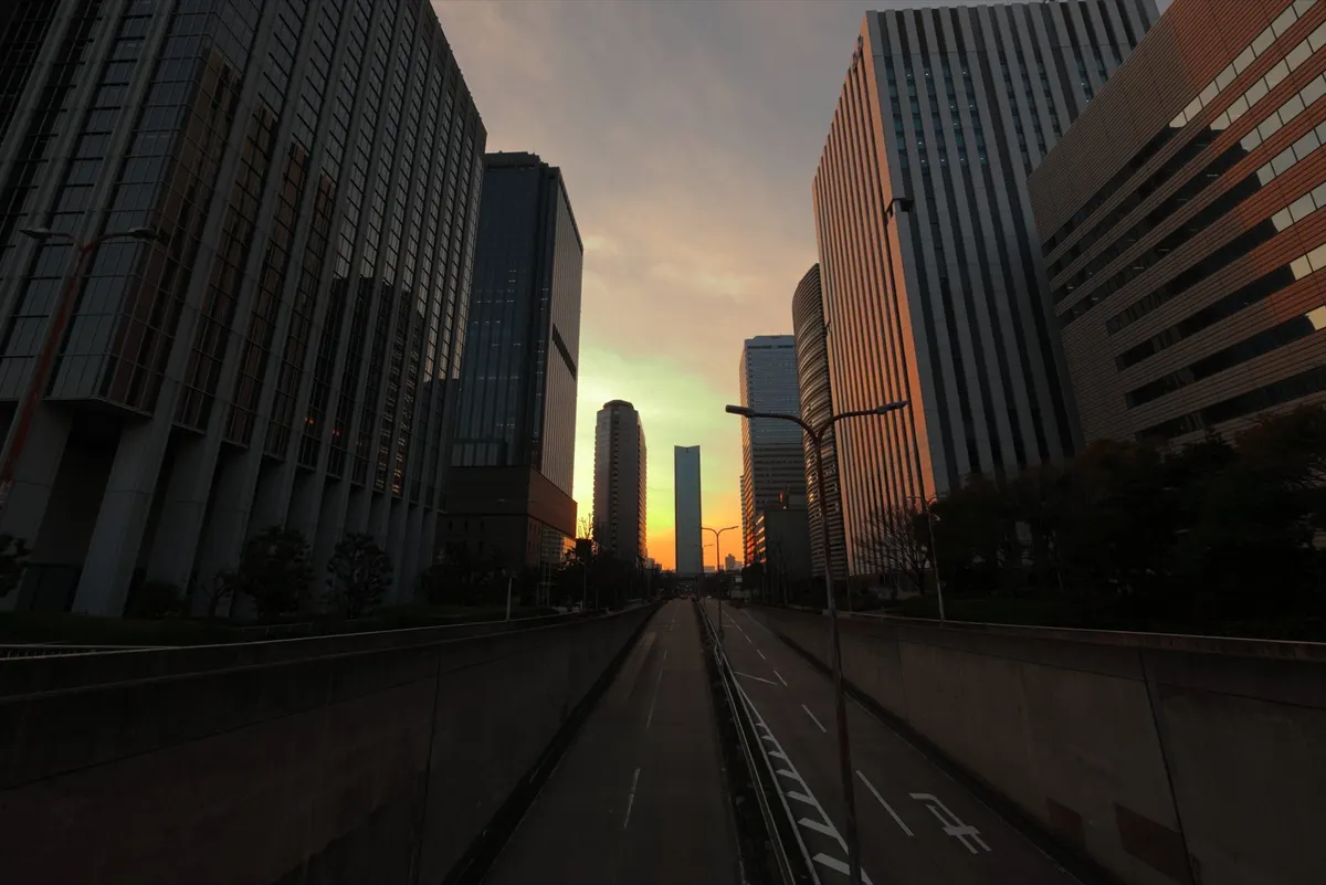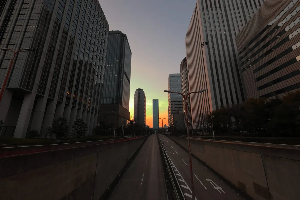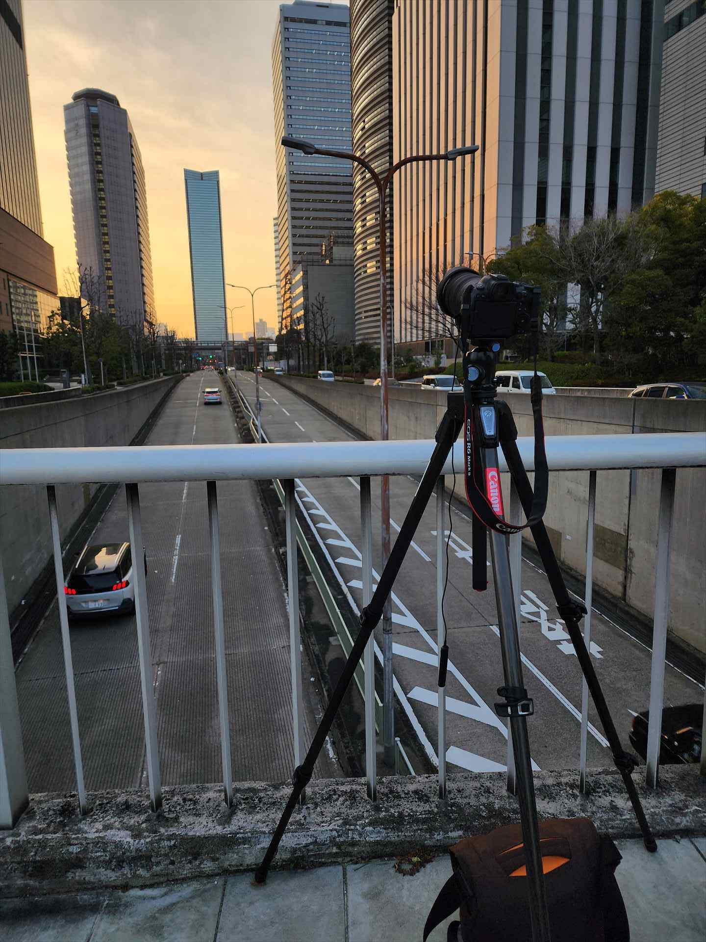 振り返れば、12月の撮影実習から数えて今回で3度目の訪問となる大阪ビジネスパーク(OBP)。 向かったのは、ビルの谷間を走る道を見下ろす陸橋の上です。まだ明るい16時半に現地へ入り、愛機EOS R6 Mark IIをマンフロット055に据えました。超広角レンズのファインダー越しに、刻々と色を変える西空を眺めながら、光のドラマが始まるのを静かに待ちます。ピント、ホワイトバランス、いずれもマニュアルです。