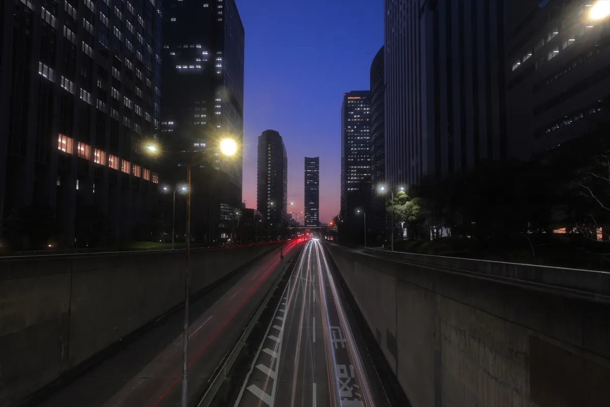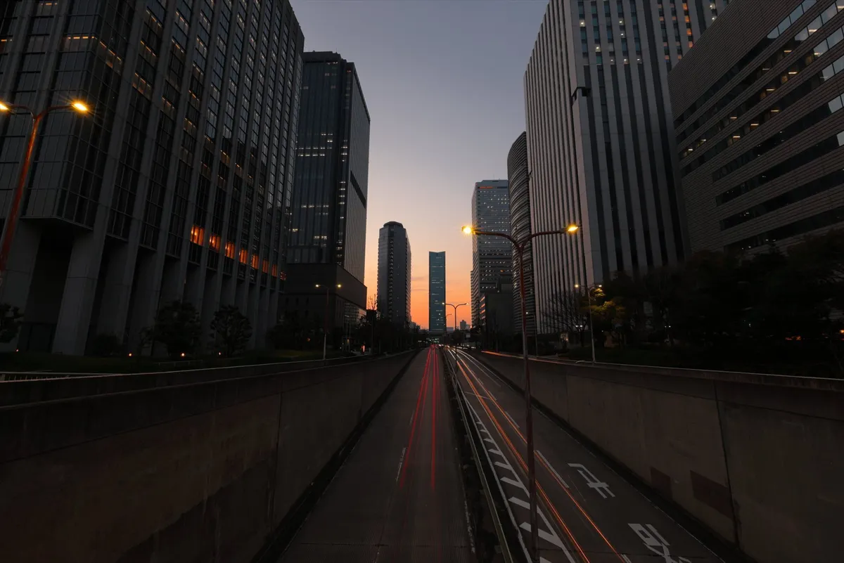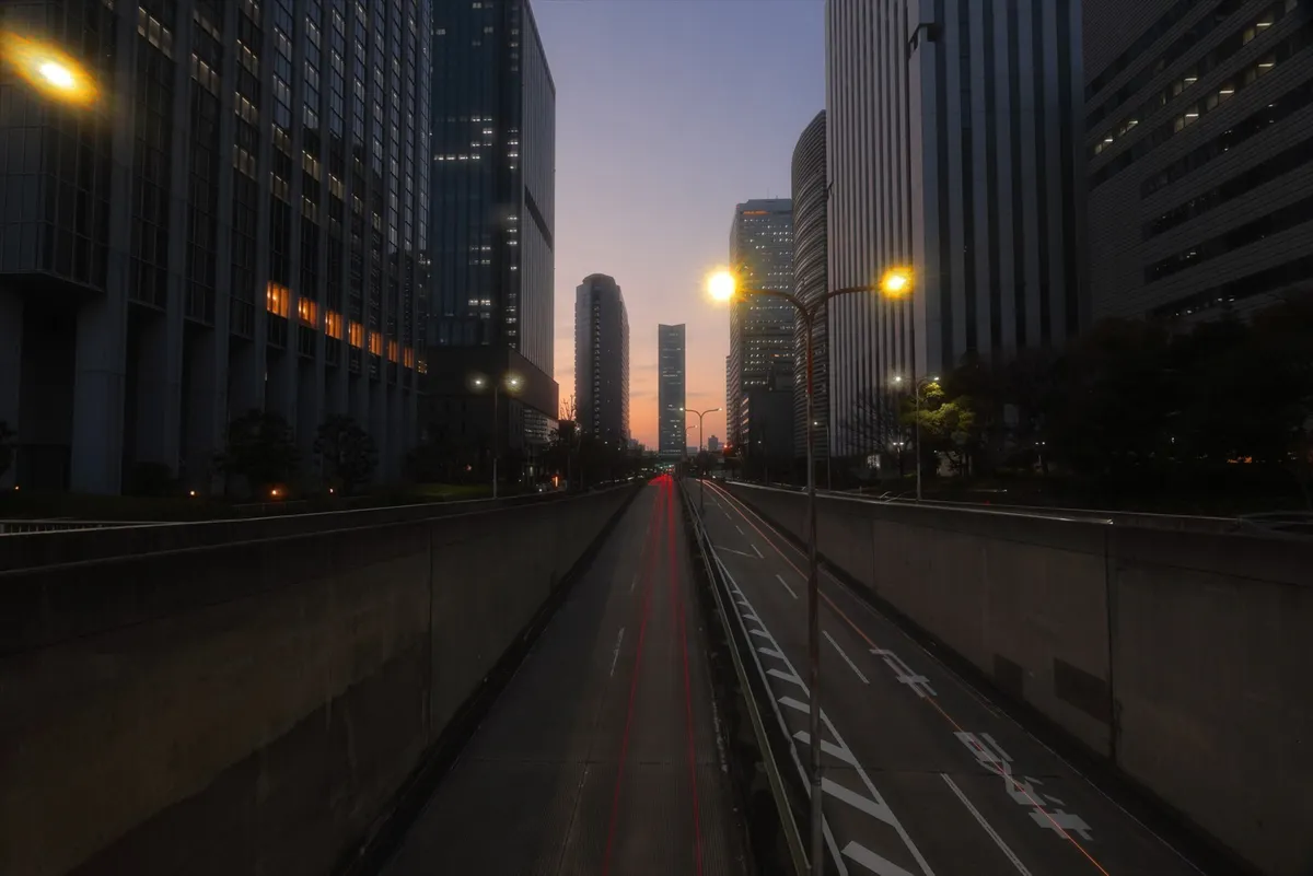 日没前、空にわずかに残る光とビルのシルエット。長秒露光の旅をここからスタートさせます。
