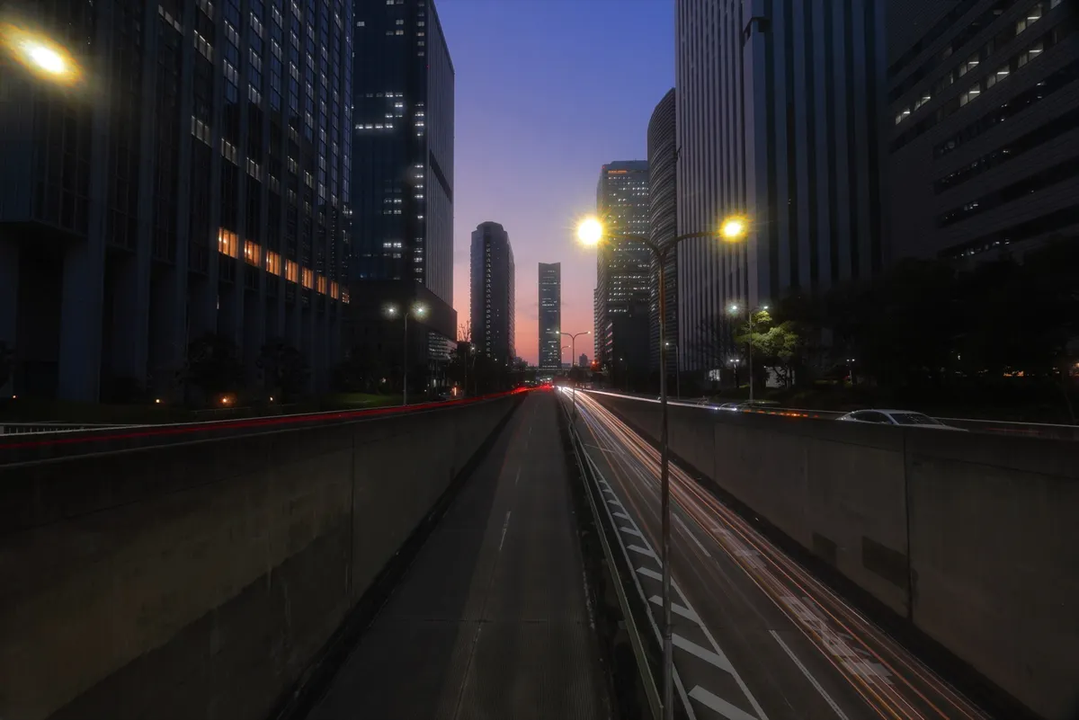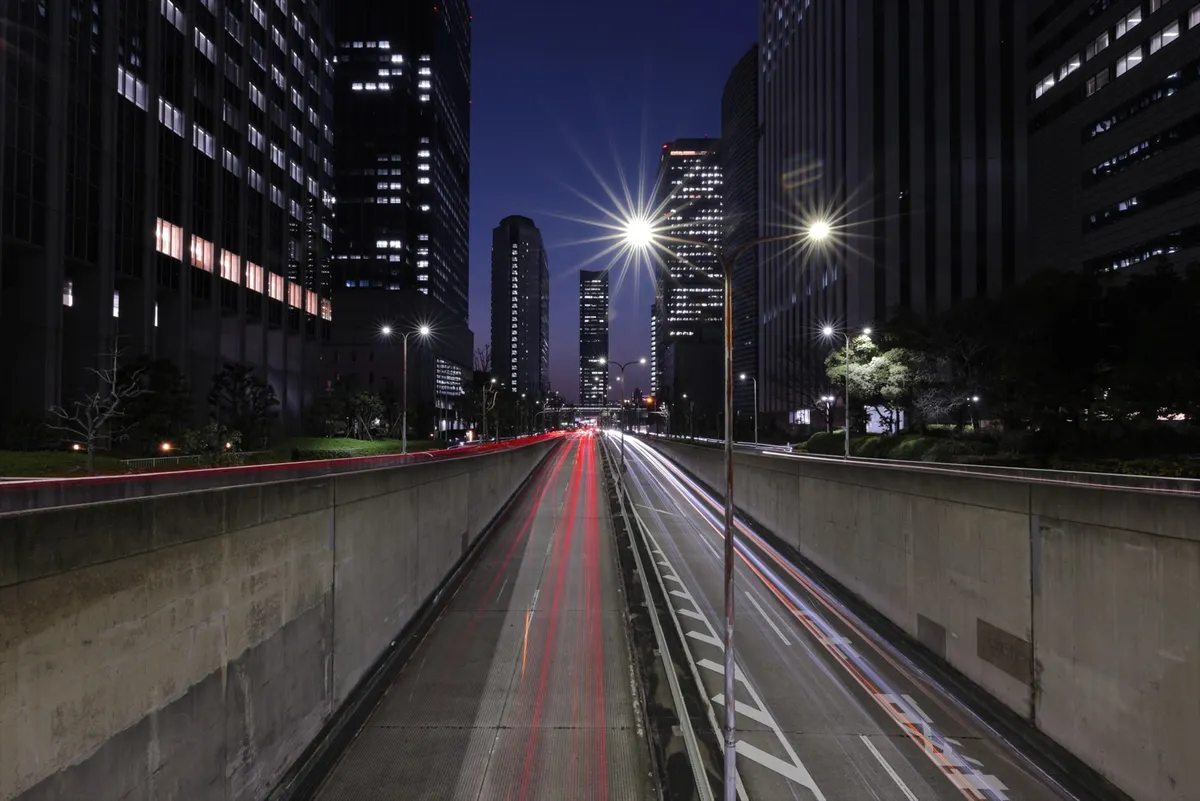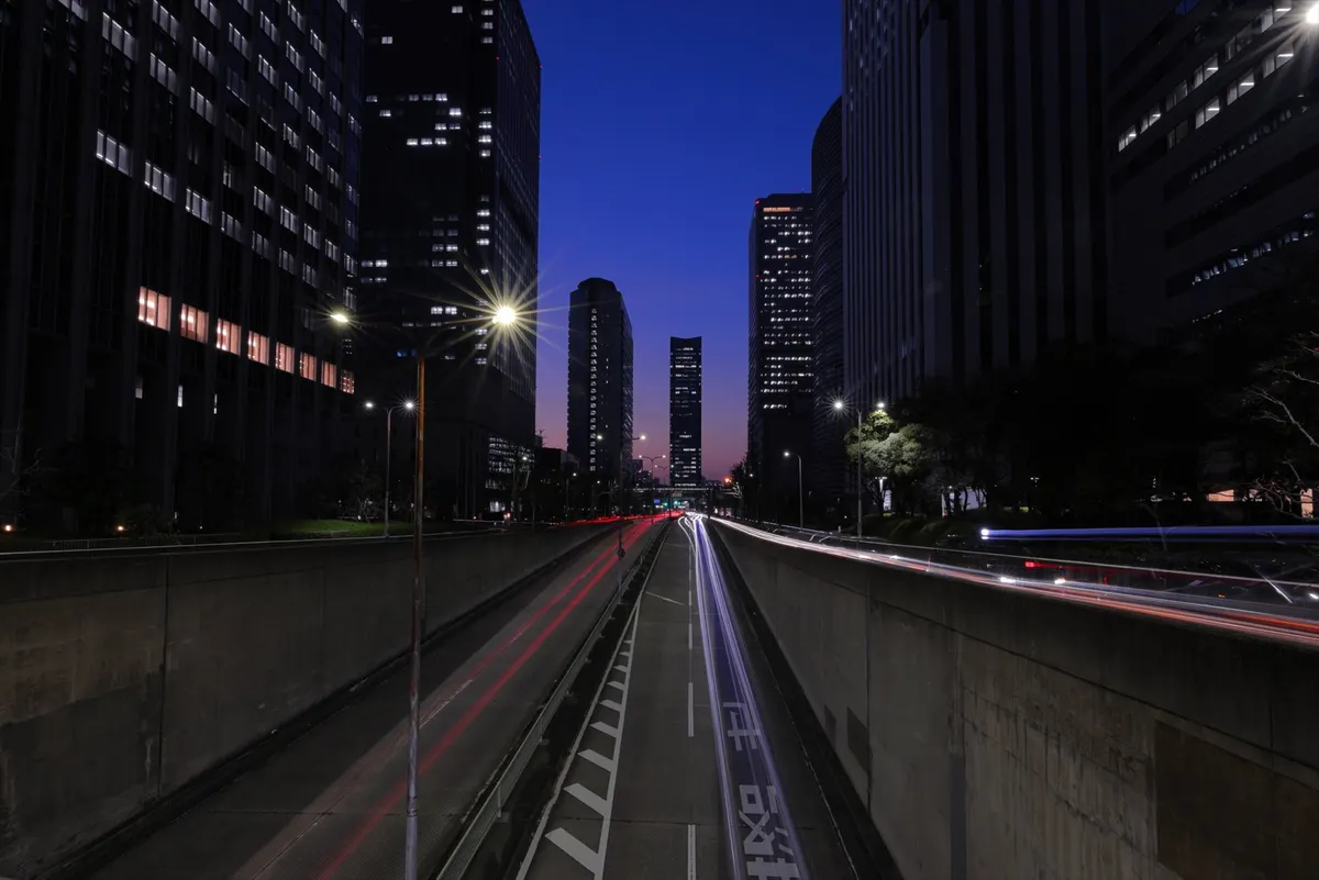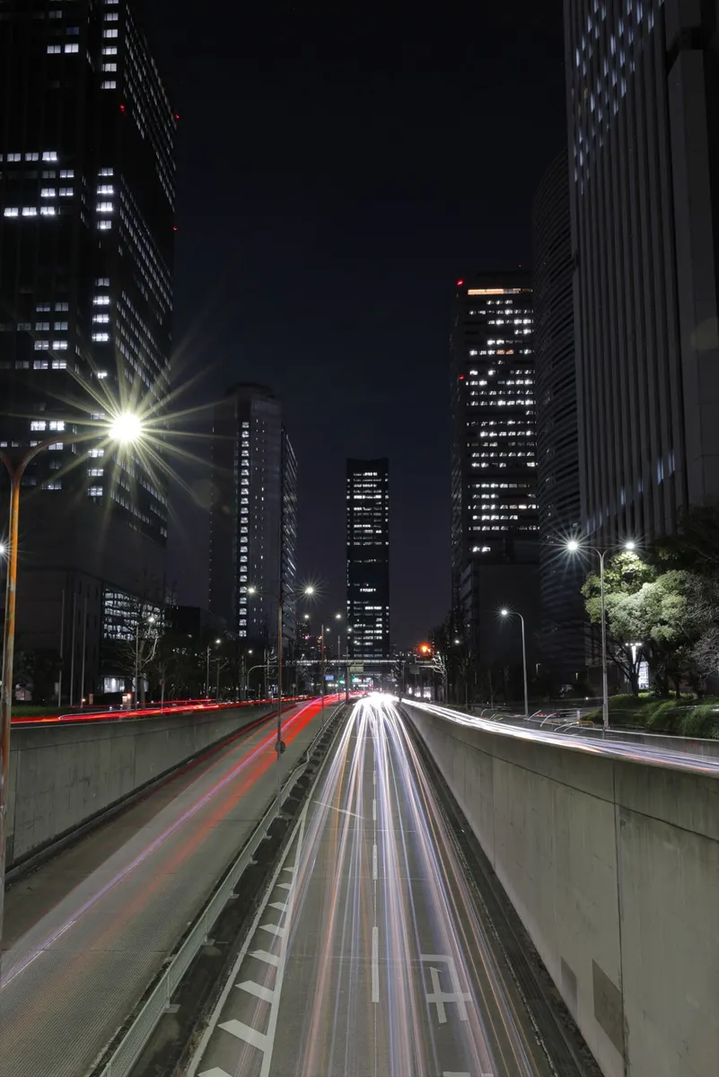 交通量の少なさをカバーするため、露光時間をさらに延長。静かな道路に、確かな光の意志を描き込みます。