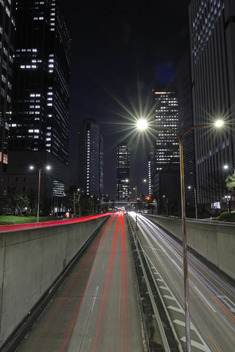 縦構図への切り替え。天を突くビルの垂直線と、地を這う光跡の水平線。