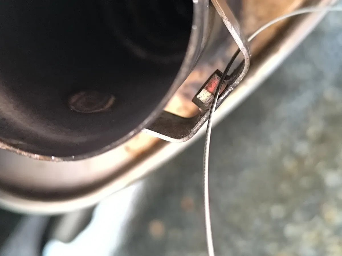 マフラー出口のここにワイヤー通してマフラーカッターを取り付け。