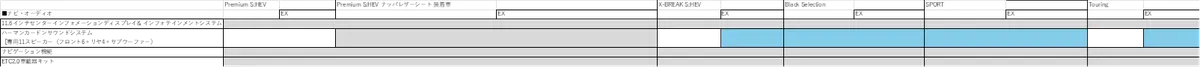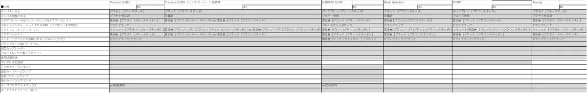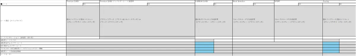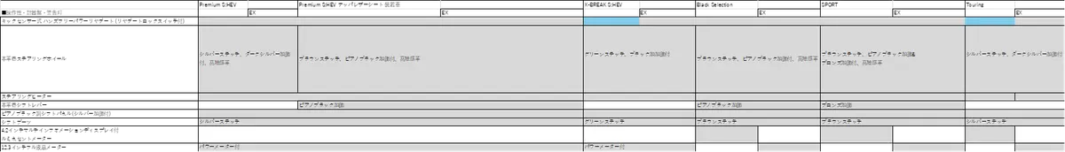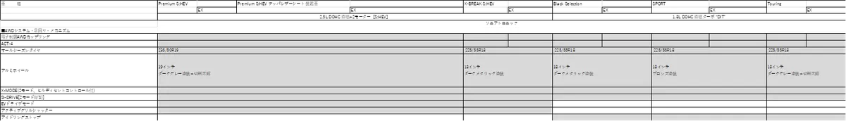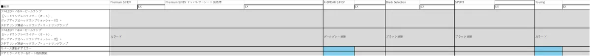 次に2. Touringについて まだ、ホイールのサイズは分かりませんが、海外仕様にはアイキャッチ画像に仕様したSPORT(ブロンズ)/Black Selection(ブラック)/X-BREAK S:HEV(ブラック)と同じデザイン意匠で18インチの切削光輝のホイールがあります。なのでTouringもそれを採用されるのではないかと思いました。噂によると、Touring は廉価仕様になるそうなので、アイサイトXが装備されない仕様はX-BREAK S:HEVと同様に運転席と助手席のパワーシート、シートポジションメモリー機能、パワーリヤゲート、運転席シート自動後退機能をメーカーオプションにしてくるのではないかと予想しています。それで、Touringは370~380万円、Touring EXがSPORTと同等の400~410万円くらいに収まるのではないかと期待しています。現行型の主要装備表をもとに、新型の装備表を作ってみました‼ あくまで予想です。