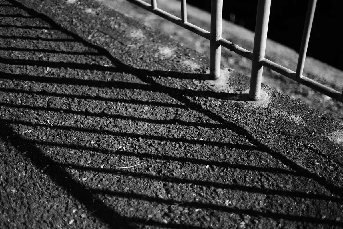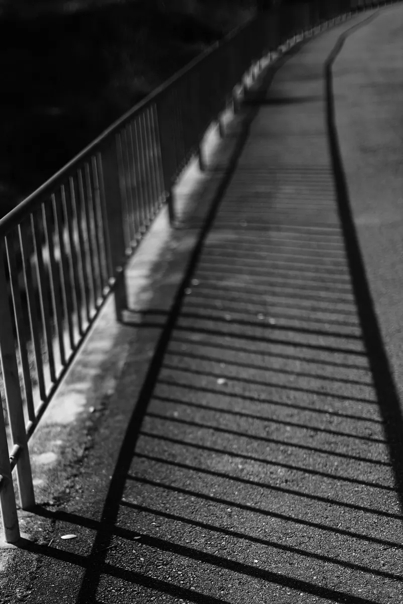 モノクロにすることで、アスファルトの質感とフェンスが作る規則的な影のパターンを強調。冬の低い日差しが生む「光の造形」をアート的に切り取っています。