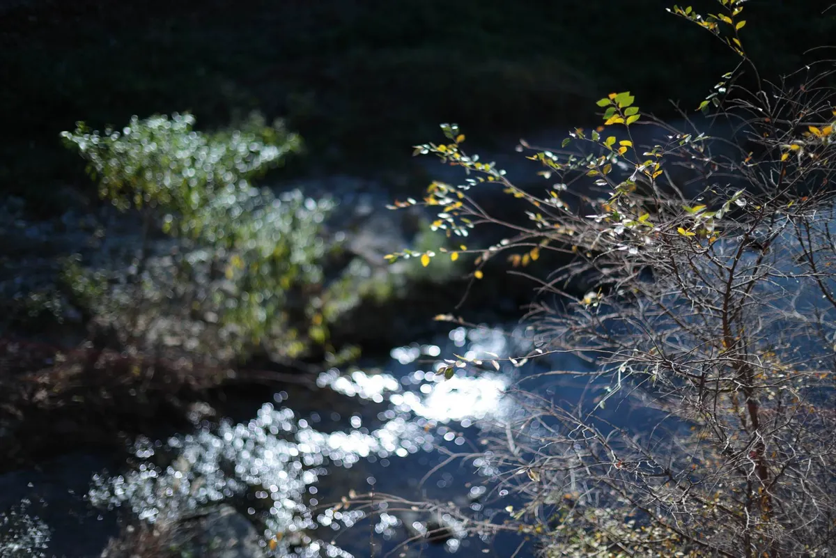 あえて手前の繊細な枝葉にピントを固定することで、背景の川面に反射する強烈な冬の光を、形を持たない「光の粒(玉ボケ)」へと昇華させています。