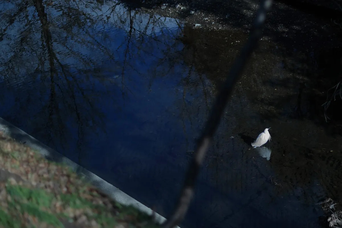 暗く深い青に染まった水面と、そこに佇む白いコサギ。引きの構図にすることで、都会の中の川とは思えない幻想的で孤独な美しさを強調しています。