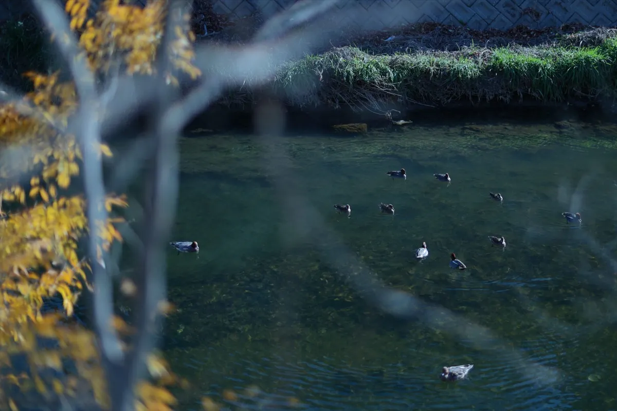 前ボケの枝越しに鴨の群れを捉えることで、観察者のような視点を演出。千里川の豊かな生態系を、穏やかな色調で表現しています。