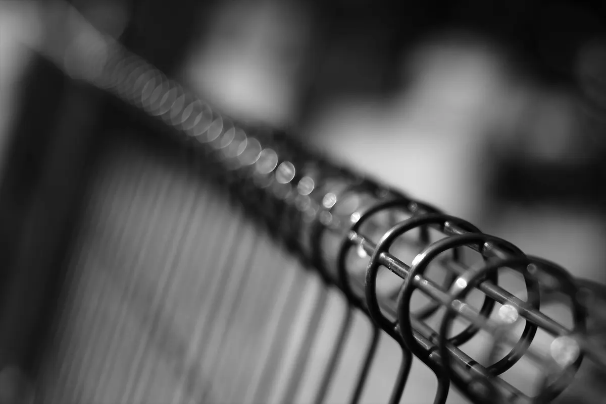 フェンスの意匠を極至近距離から捉え、ボケのグラデーションを楽しむ一枚。RF45mm F1.2のレンズ性能を極限まで活かした、マクロ的視点での抽象表現です。