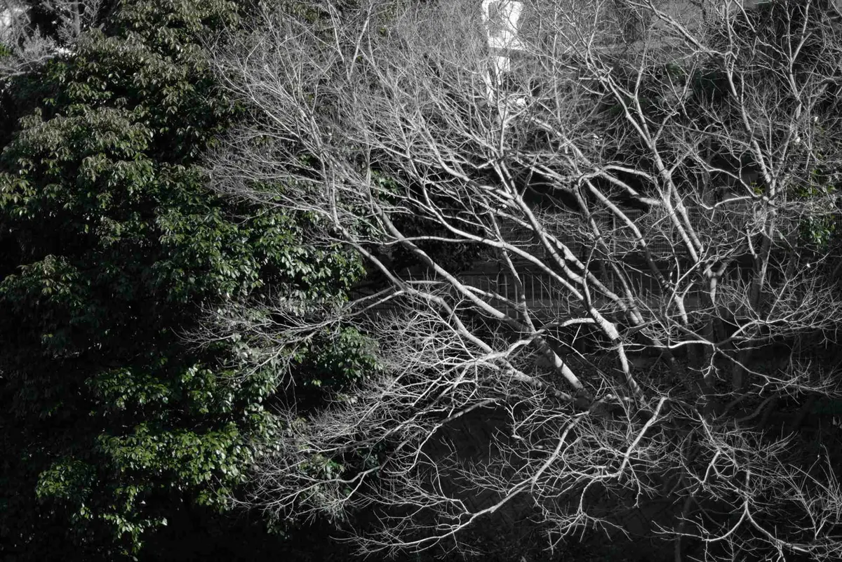 常緑樹の深い緑と、落葉した白い枝の対比。自然界の「生命のサイクル」を一画面に収め、お正月らしい静謐な空気感を狙っています。