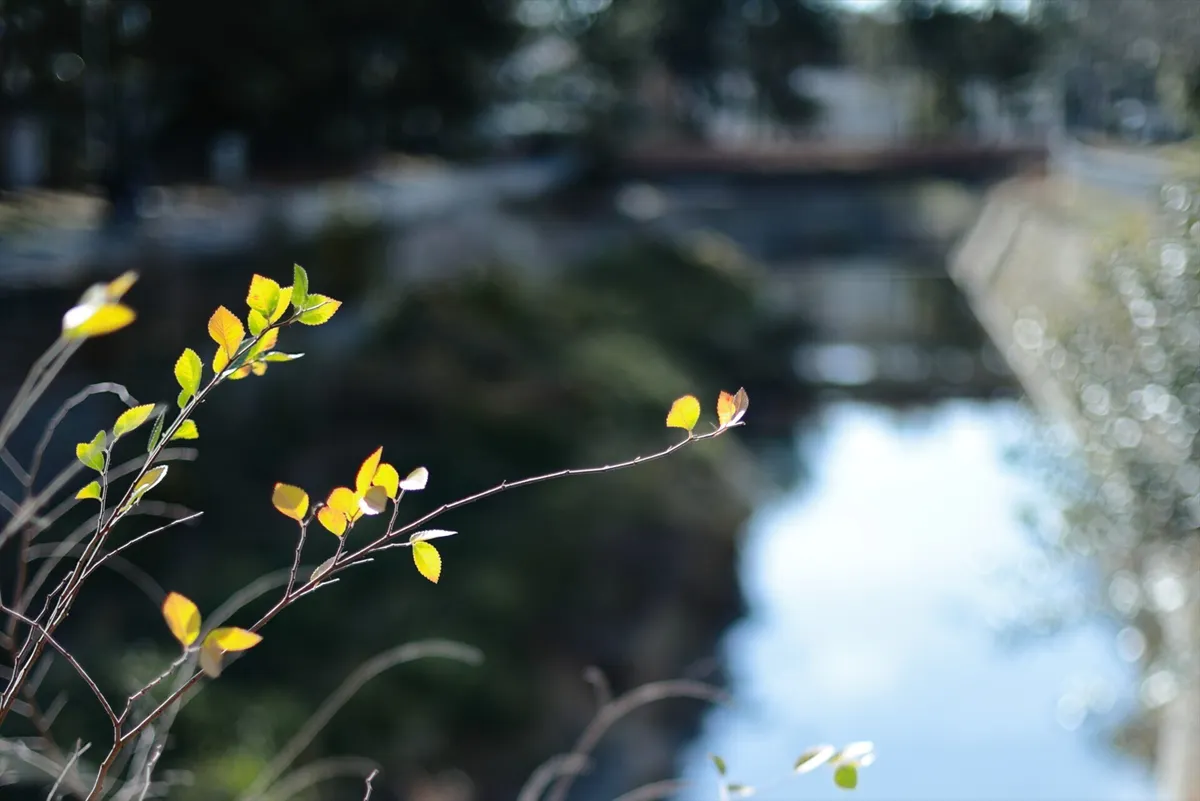 逆光に透ける木の葉を主役にし、冬の光の透明感を表現。背景の千里川を大きくボカすことで、寒さの中にある「暖かな生命の輝き」を強調しています。