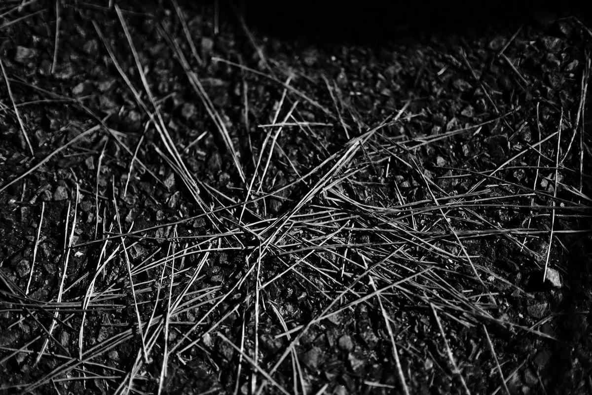 散らばった松葉と地面の凹凸にフォーカス。モノクロによってコントラストを高め、足元の何気ない風景に宿る力強さを引き出しています。