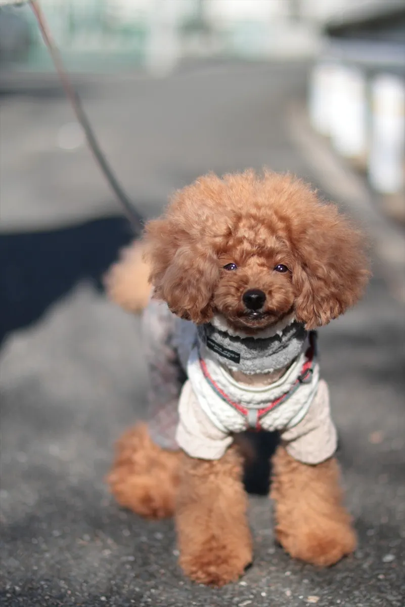 奥行きのある構図の右側にBEBEを配置し、これから始まるお散歩への期待感を表現。F1.2のボケが背景の街並みを優しく消し、主役を際立たせています。