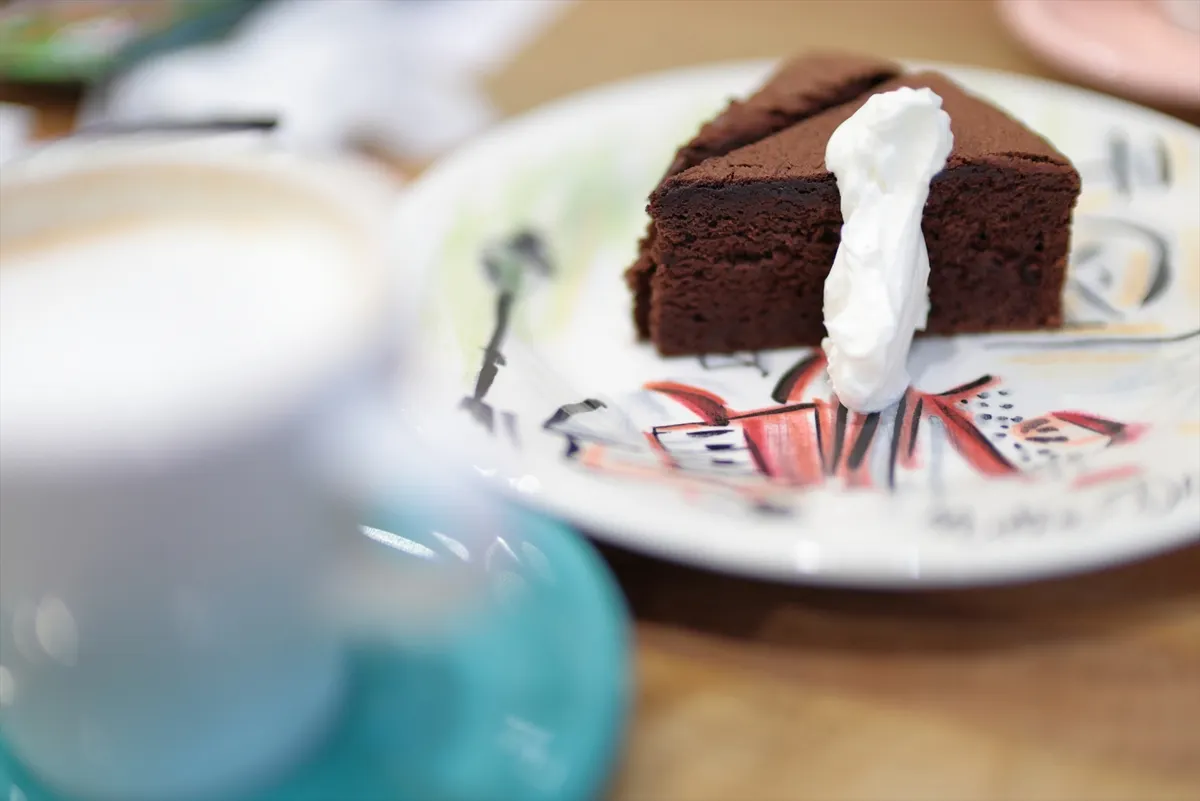 5. 濃厚なガトーショコラ。絵皿の彩りと、添えられたホイップの白が、ラテの泡と重なって贅沢なコントラストに。