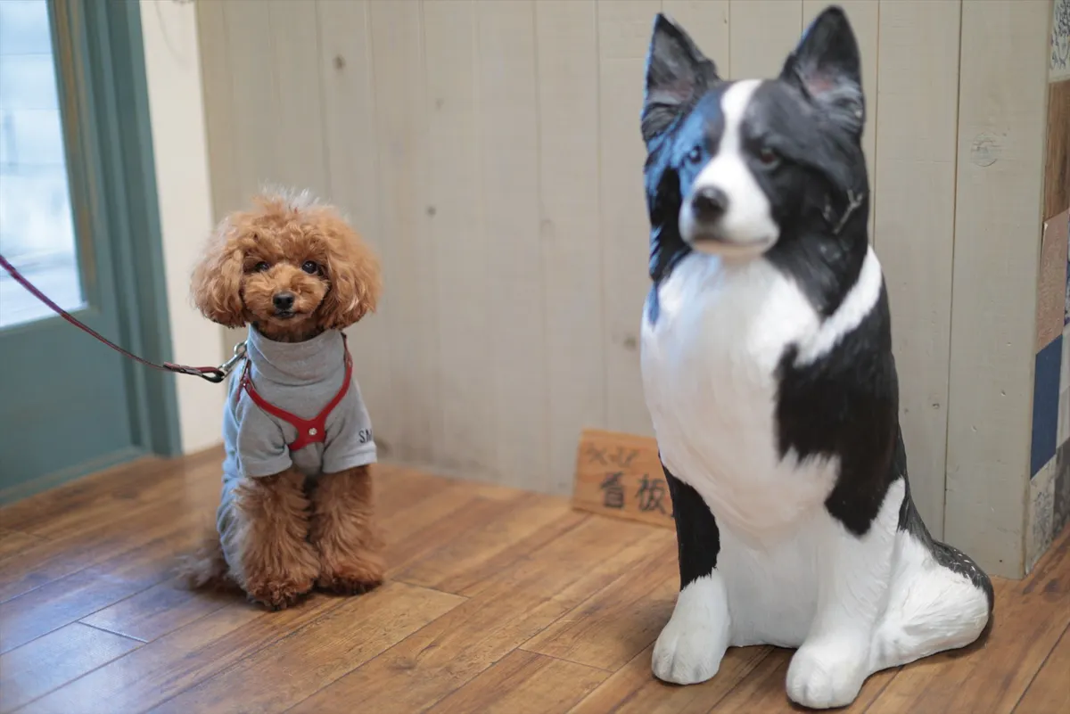 8. 看板犬の模型と並んで記念撮影。少し緊張しているような、絶妙な距離感が微笑ましい一枚。
