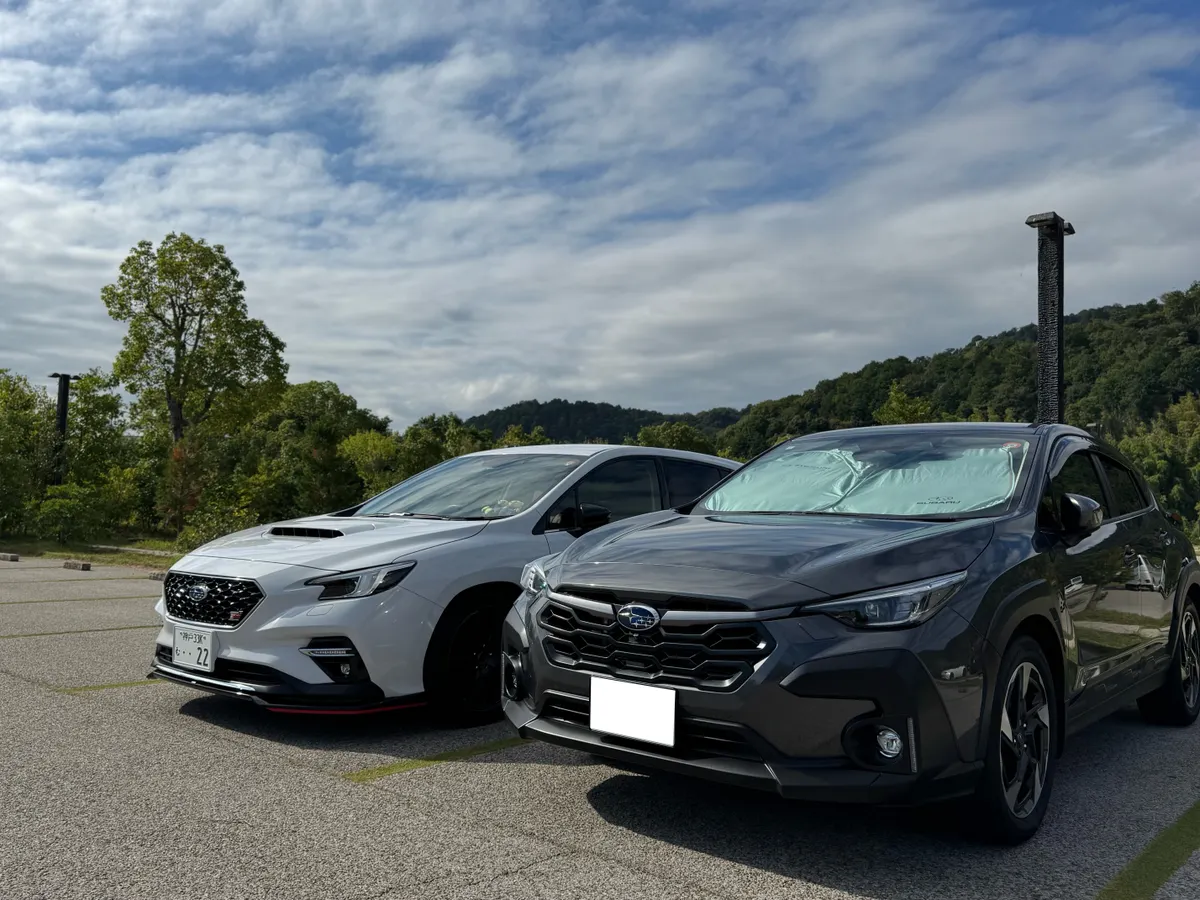 夕日に染まるクロストレックとレヴォーグ