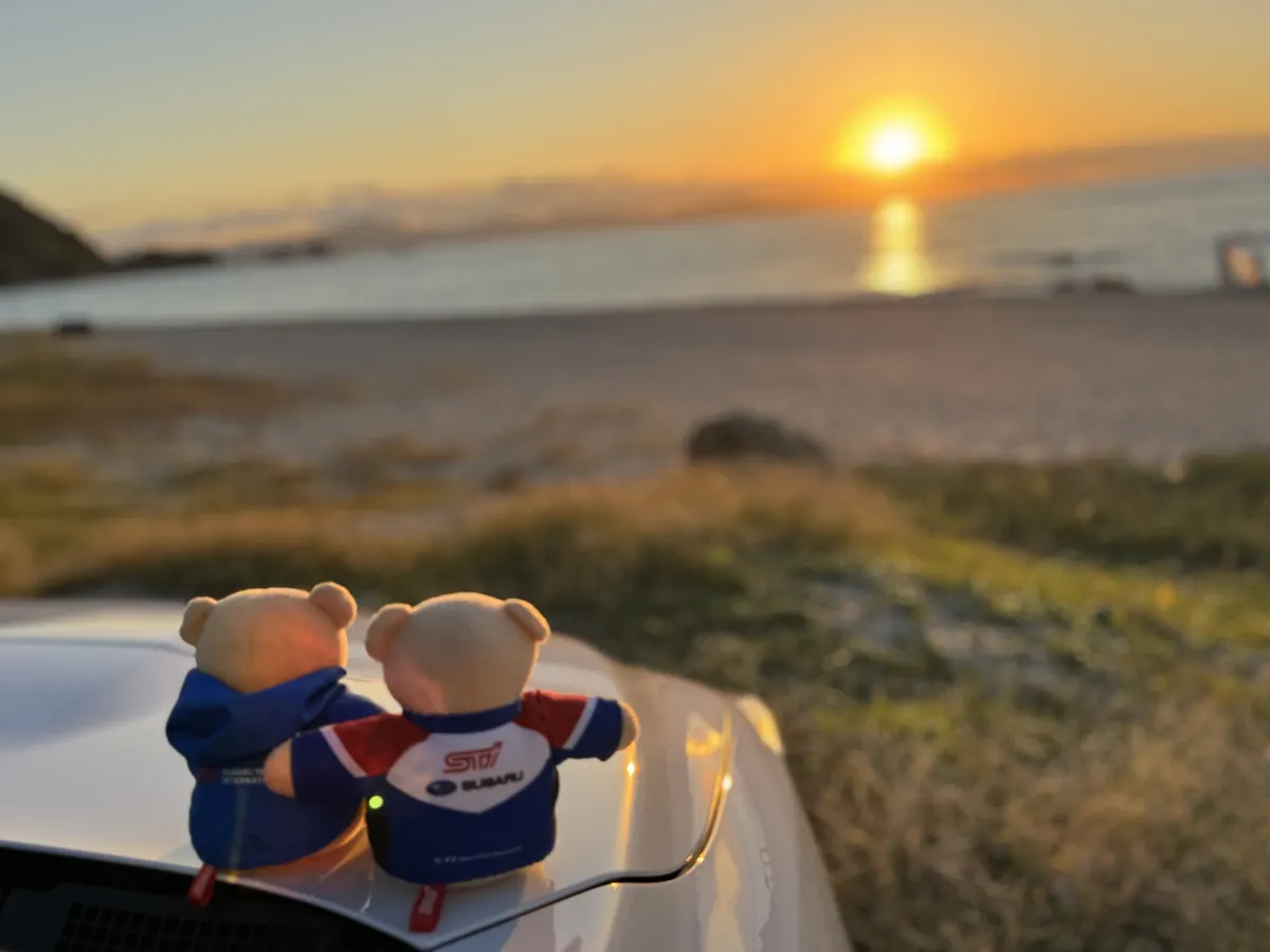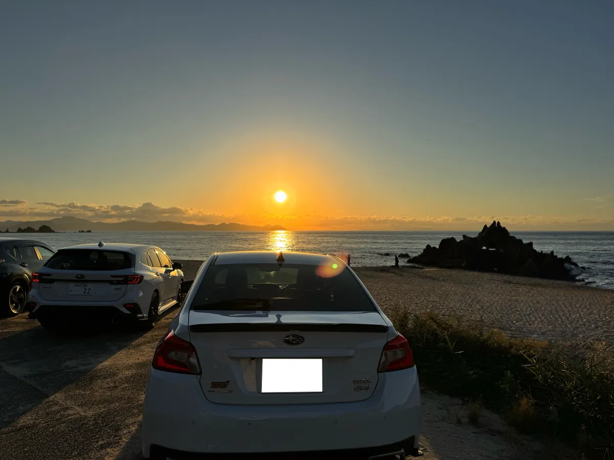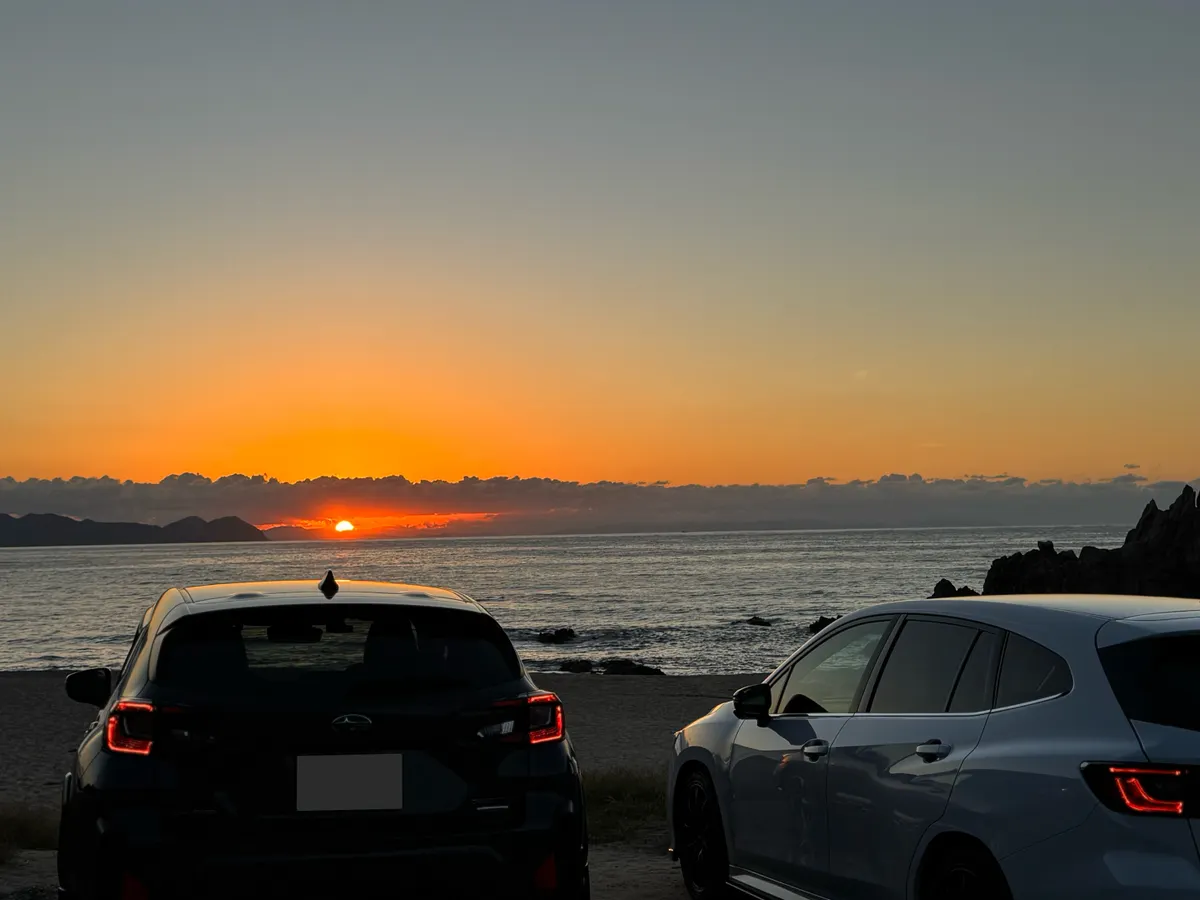 沈みゆく太陽を名残惜しそうに眺めるS4とレヴォーグ