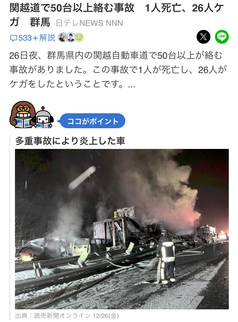 当日は朝のニュースを見て単なる不慣れなドライバーの冬の事故思ってたら規模にビックリ。