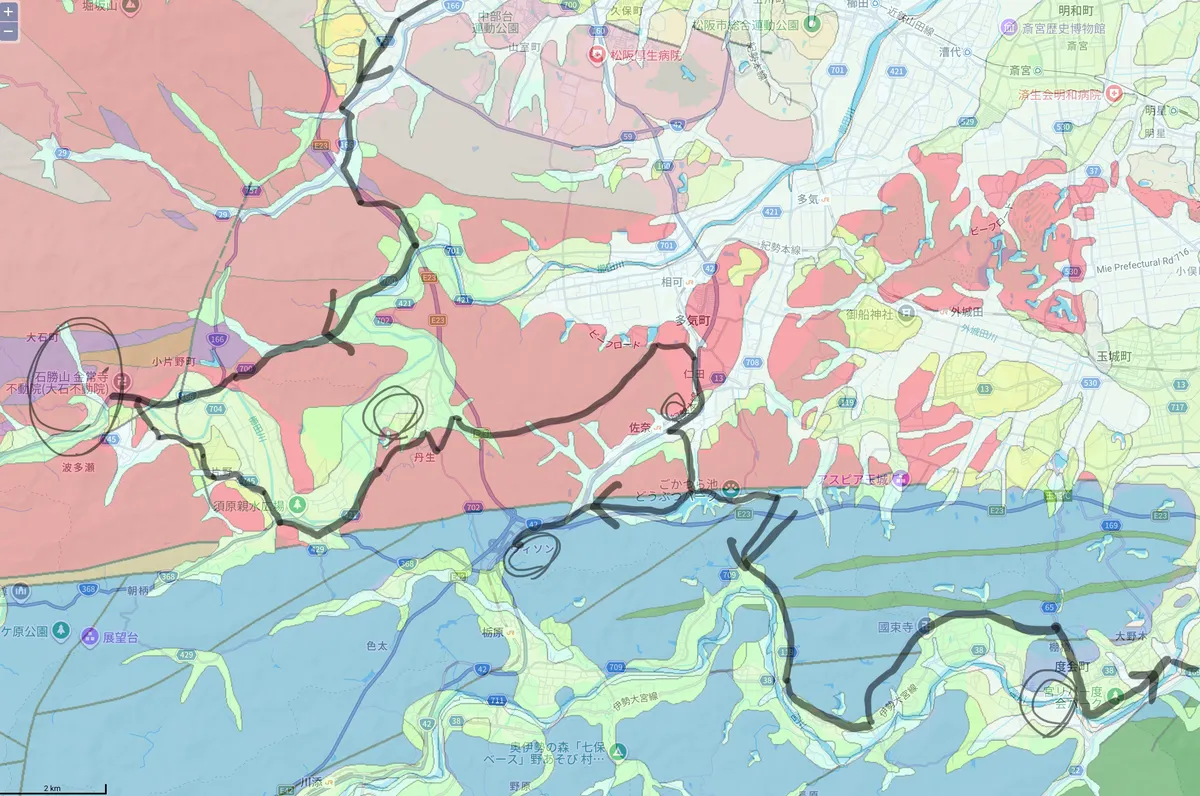 実は、ワタクシが地質や断層に興味を持つようになったのは、subaroad長野で妙高ビジターセンターを訪れたことがきっかけでした。ちなみにsubaroad伊勢のルートは、中央構造線真上を走る形になっていますね。↓ 地質図Navi(産総研)に手を加えたもの。赤と青の境目が構造線です。