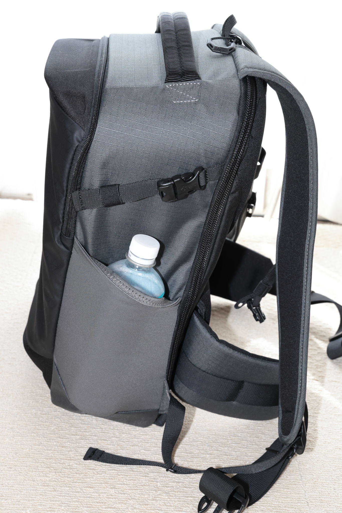 15. やはり大事なペットボトルポケットは、三脚入れと兼用です。出っ張っている上下には、耐摩耗性に優れたEVAバンパーが採用されているので、バッグを地面に置いても安心です。