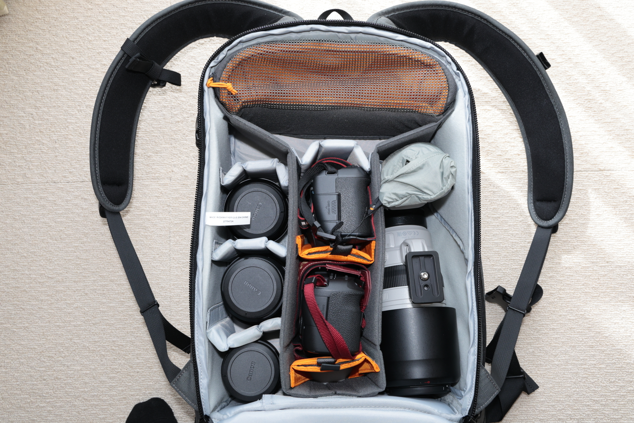 14. 試しにボディ2台、100-400mmの望遠、14-35mmの超広角、24-105mmの標準、45mmの単焦点を入れてみました。これでまだ、上の小物入れに余裕があります。また、背面フラップには15インチのノートPCが入ります。まぁ、あまり重たい機材は入れず、雨具とかフィルターとか細々したものを入れようかと思っています。