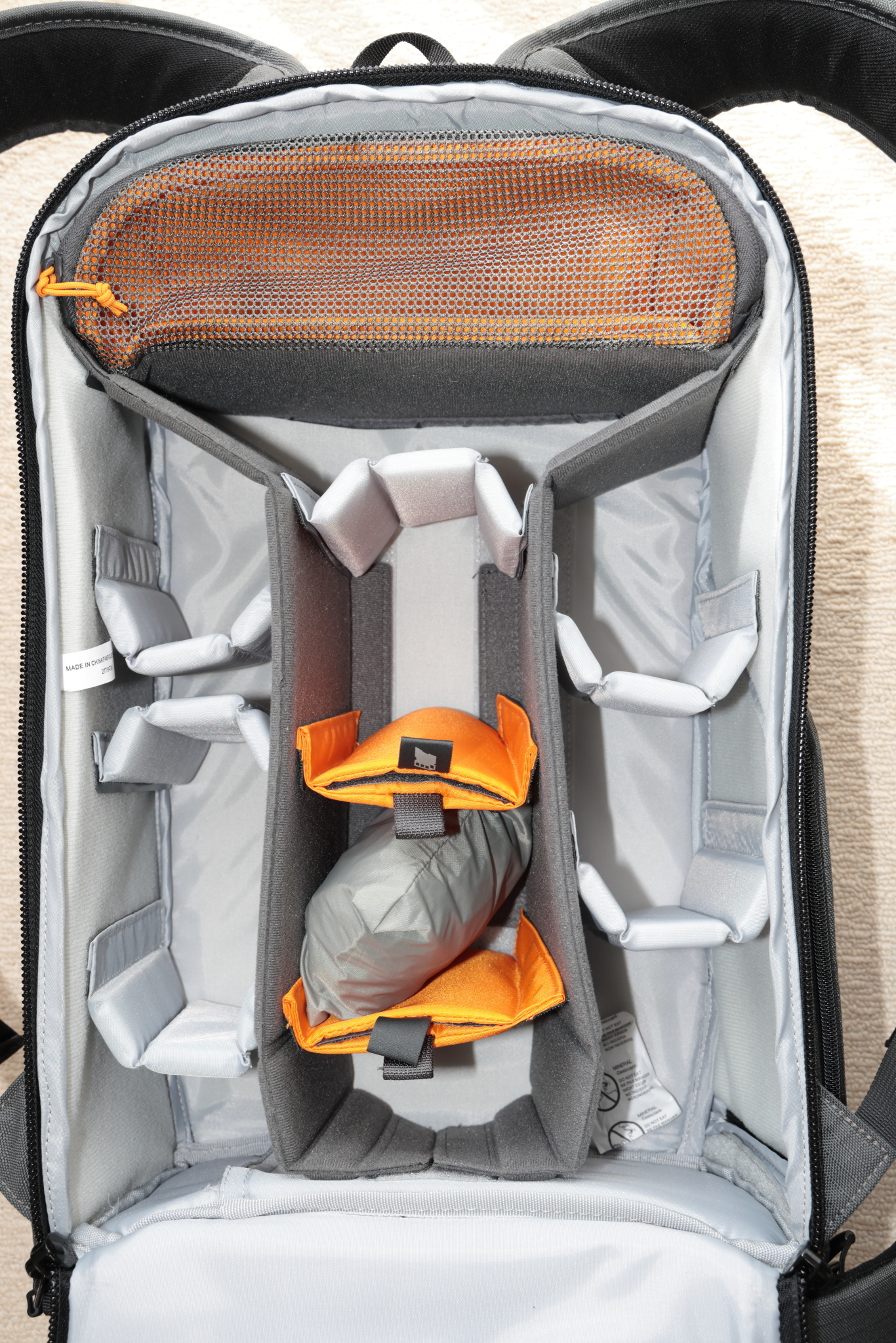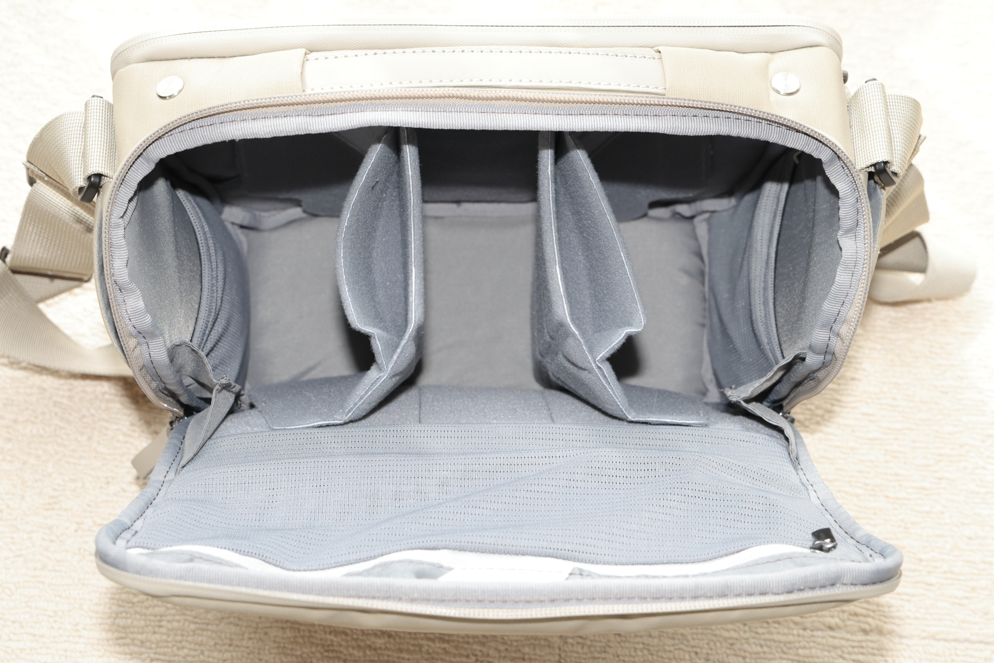 4. 気に入ったのは、このガバっと大きく開くメイン収納スペース。両サイドにポケットがあり、仕切りは単焦点レンズを2段重ねできるようになっています。