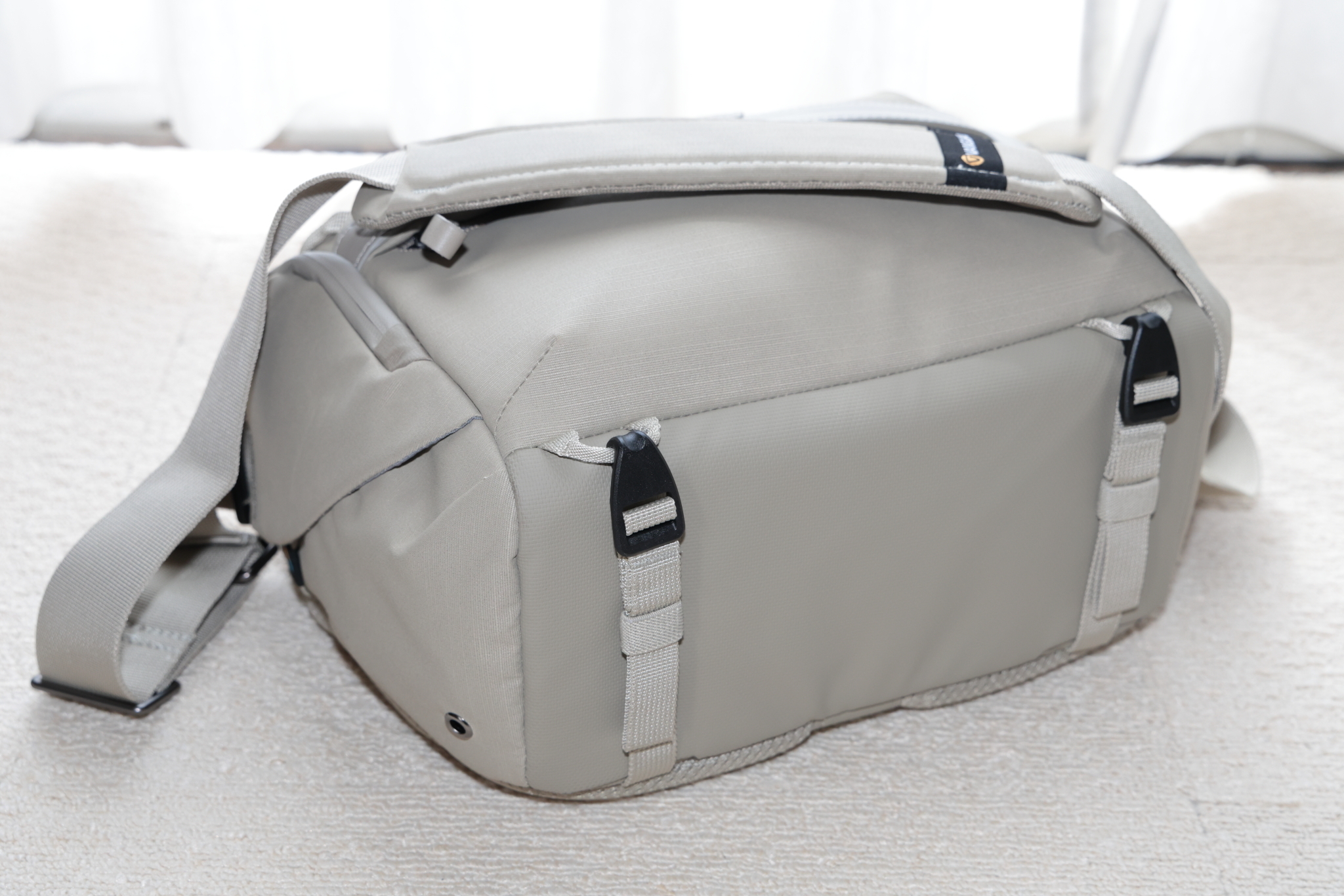 7. バッグの底には三脚固定用のベルトがあり、上着などもぶら下げることができます。これを見るとトラベル三脚が欲しくなりますね~。
