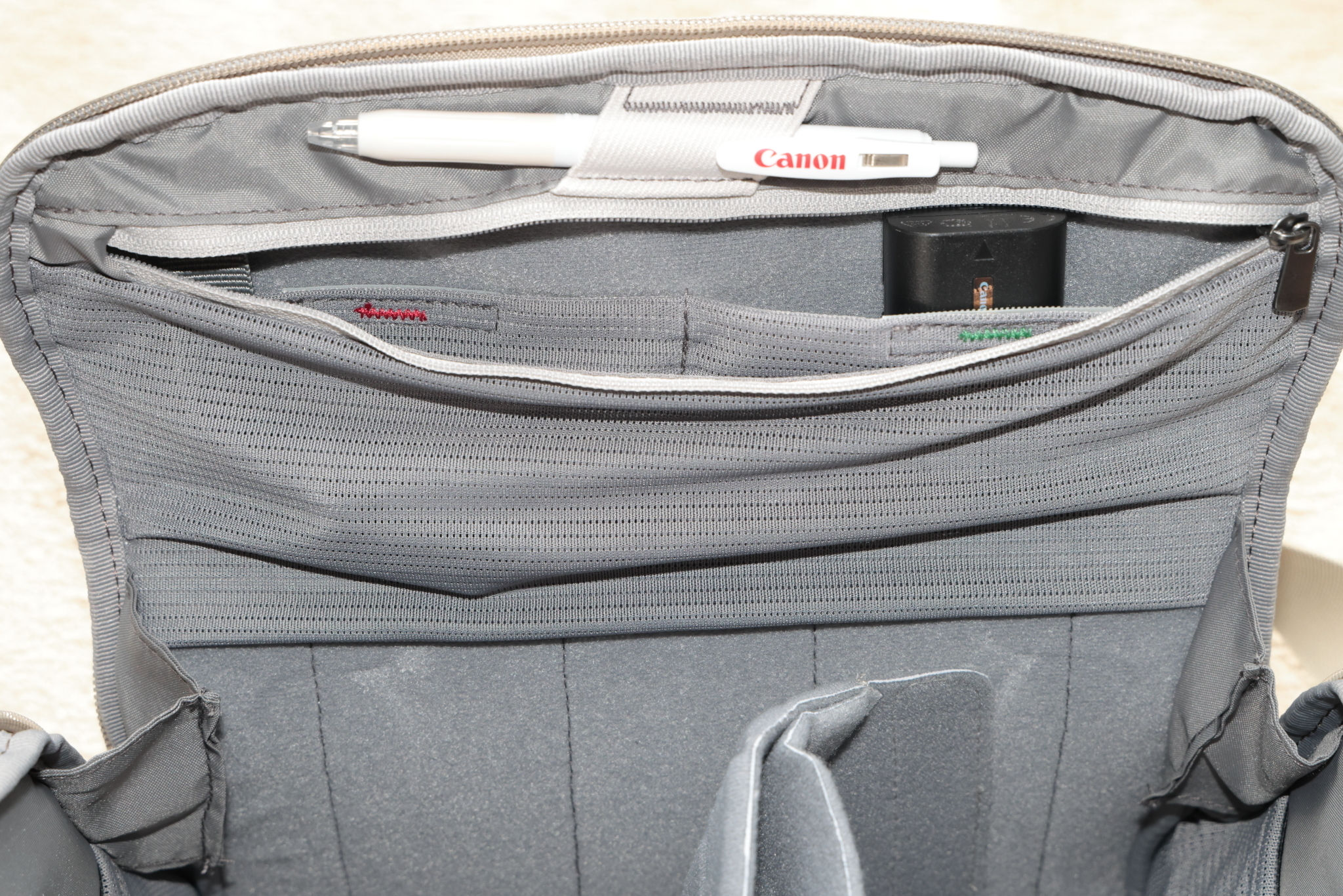 6. フラップの裏側にもポケットがあり、小物を入れることができます。最近の新しいバッグには、こうしたバッテリー収納に、充電済みの「緑」と使用済みの「赤」の印が入ったものが多いです。
