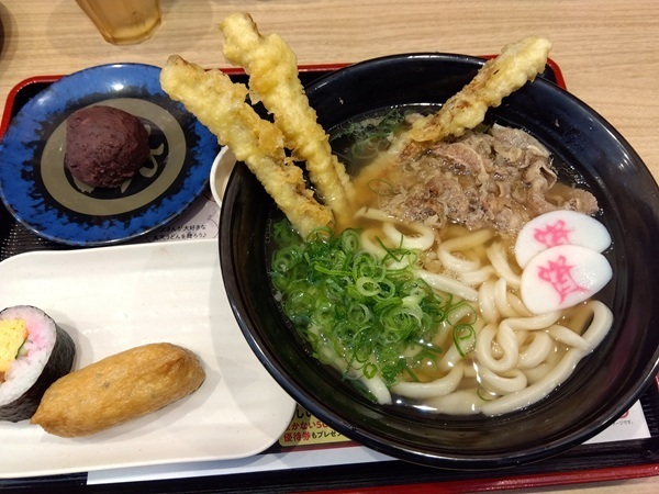 定番の肉ごぼ天うどん と、お稲荷さん なぜか?締めの定番とされている ぼた餅を