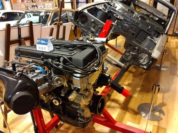 ミュージアム内の一番奥には、レストア中のカローラレビン(TE27)がレストア作業を紹介するパネルと共に展示中。