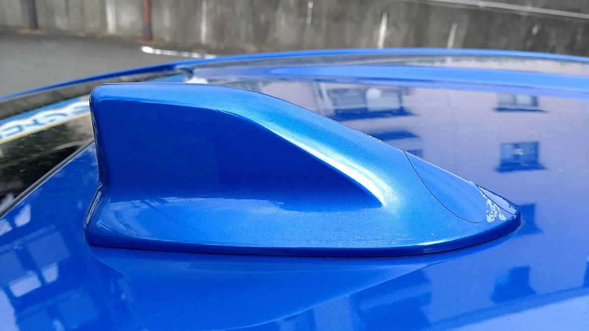 前方部分の塗装剥げが酷く、鳥居工業さんのリペアフィルムで繕っているのが見て取れるシャークフィンアンテナ