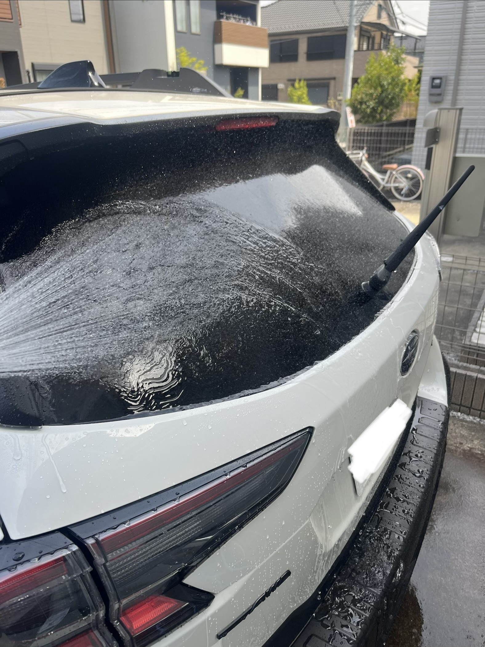 まずはリアから。カーシャンプーでガラスを洗って水分拭き取り。この時点ではしっかり撥水ですが、セットに入ってるリセット剤(コンパウンド入り)でガラスをゴシゴシ。全面ゴシったら水で流します。ここでガラスは親水状態になりました。