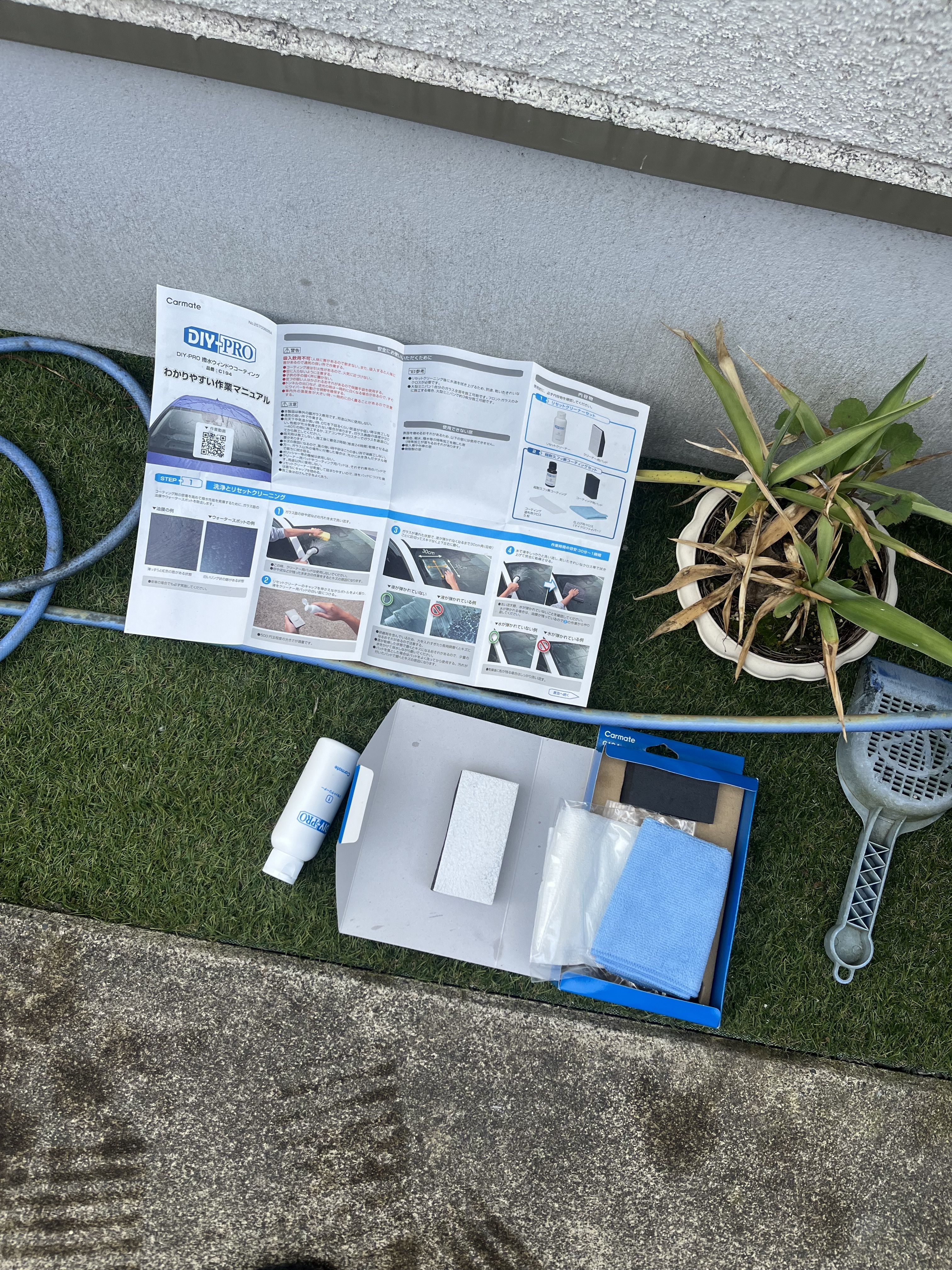 今回はいつもみたいにスプレーでサクッとではなく、油膜や古いコーティングをしっかり除去してからフッ素コーティングをかけました。ガラスのリフレッシュですね😊使用したのはCarmateさんが出されてるDIYフッ素系コーティングセット。