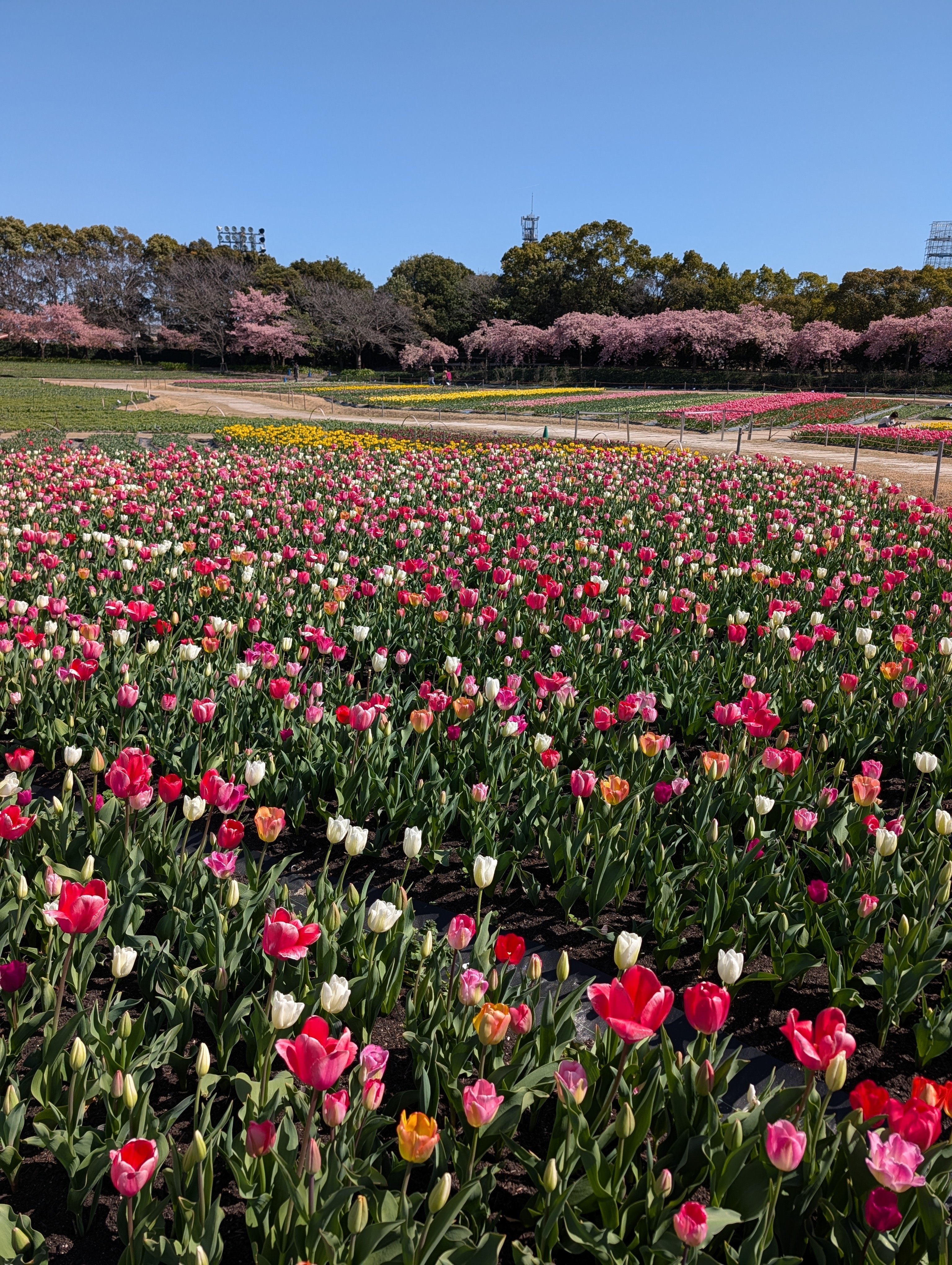 チューリップの先に見えるのは桜、間に見える通路が通行止め⛔️だったのが、残念