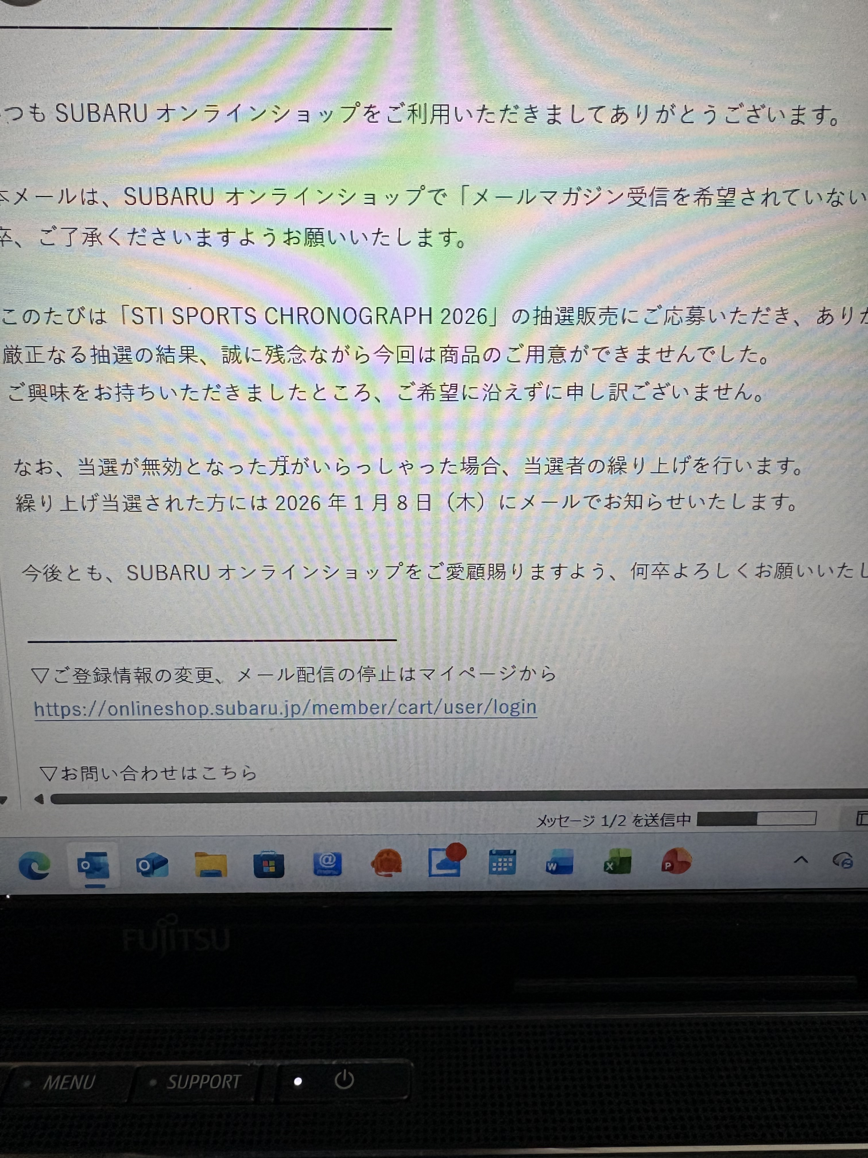 トップ > その他 > 残念ながら。 赤いぽしょ 2025/12/22 22:33 残念ながら。 スバルオンラインショップからの連絡です。 STI SPORTS CHRONOGRAPH 2026の抽選結果になります。 残念ながら落選となりました。 まー仕方ないですねー。 スバル オンライン いいね 共有する 共有する X facebook LINE リンクをコピー コメントする 0 件の返信 (新着順)