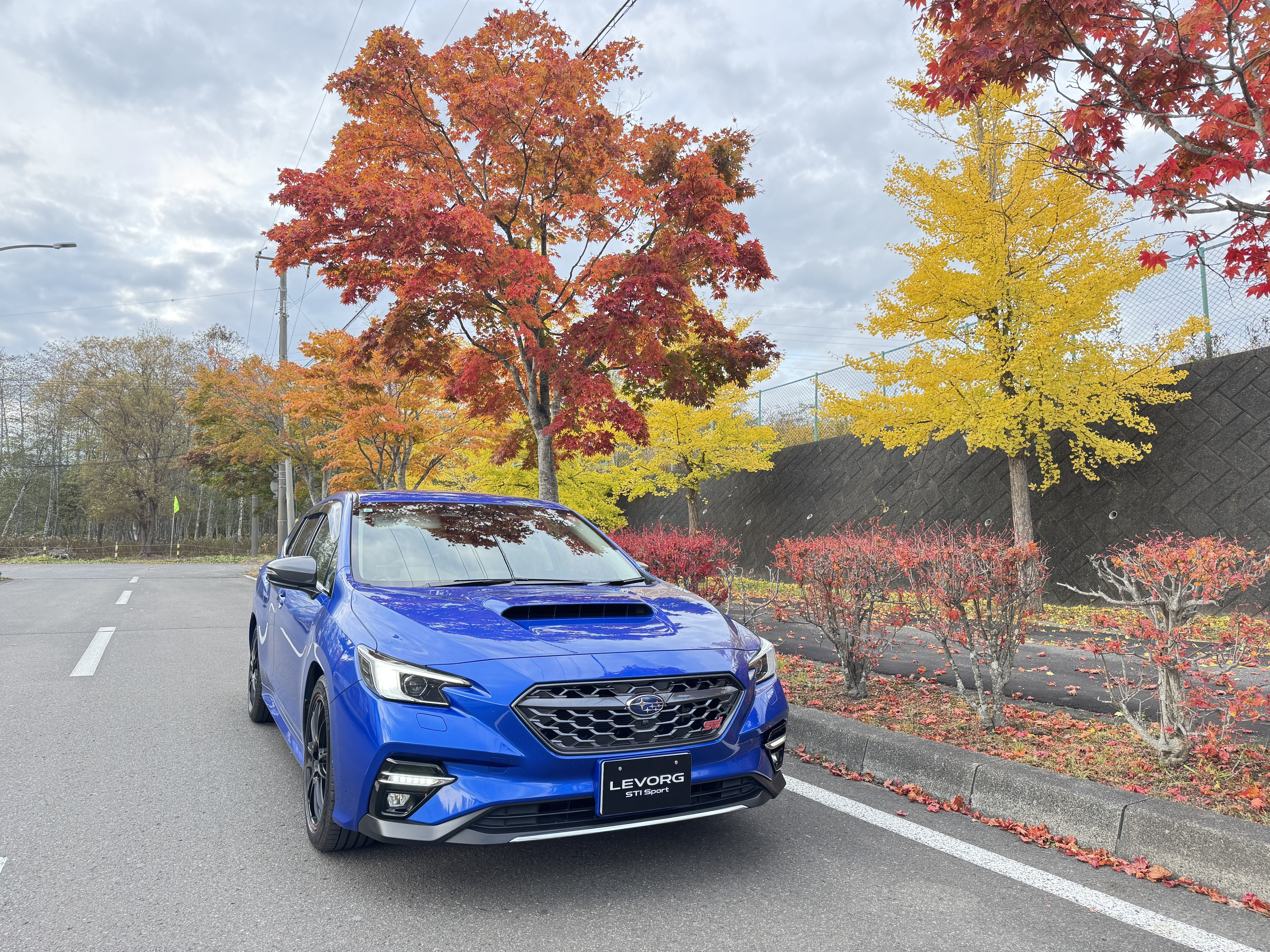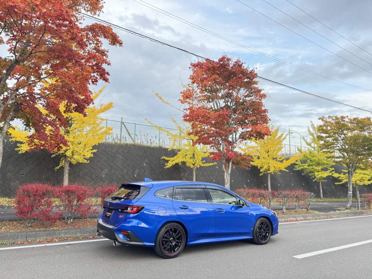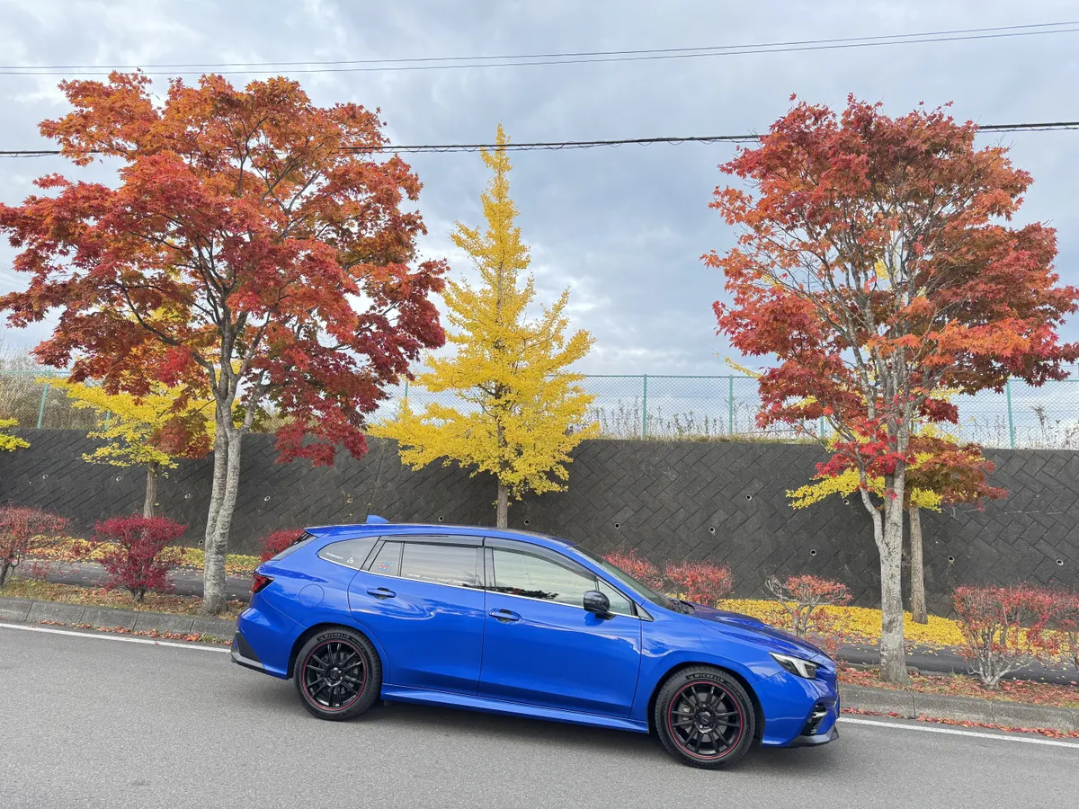 もみじの赤色と銀杏の黄色とレヴォーグの青いからなる3色のコントラストが綺麗で撮影して満足しました。