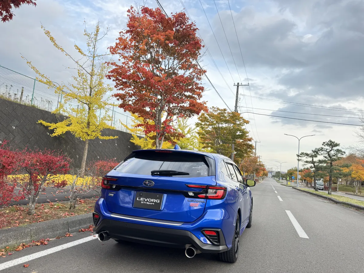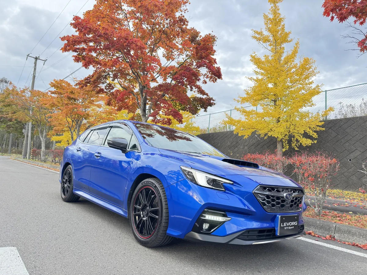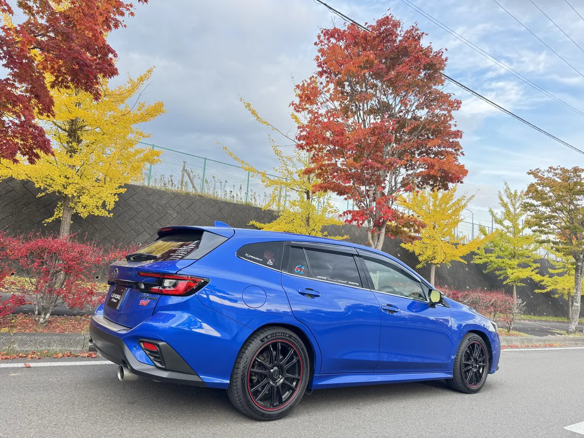 もみじの赤色と銀杏の黄色とレヴォーグの青いからなる3色のコントラストが綺麗で撮影して満足しました。