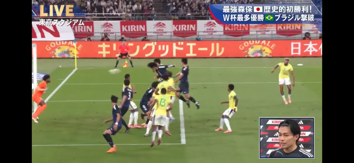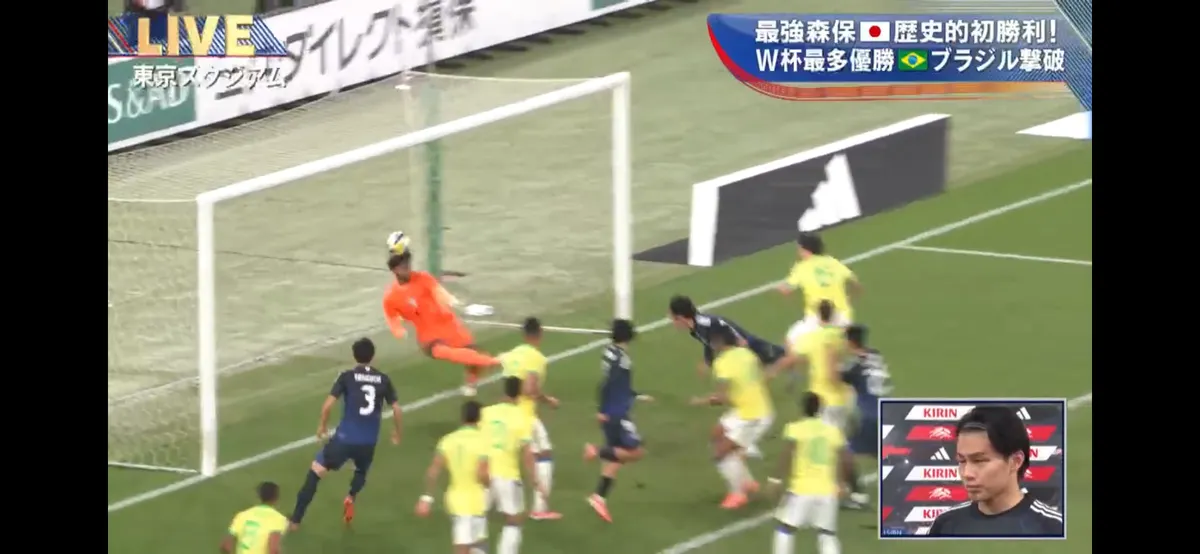 後半に勝ち越しゴールを決めた上田綺世のヘディングシュートは、ブラジル代表GKウーゴ・ソウザを吹っ飛ばすほどの威力のあるヘディングシュートだった。